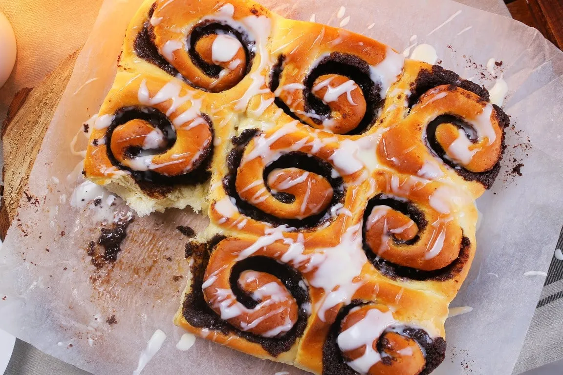 Egy sütőformát kivajazunk, majd kibélelünk sütőpapírral és 1-2 cm távolságot hagyva bepakoljuk a csigákat. Letakarjuk és ismét 1 órát kelesztjük. 165 fokos sütőben 20-25 percig sütjük. A mascarponét, a tejet és a porcukrot csomómentesre kikeverjük, majd meglocsoljuk vele a kissé kihűlt csigákat.