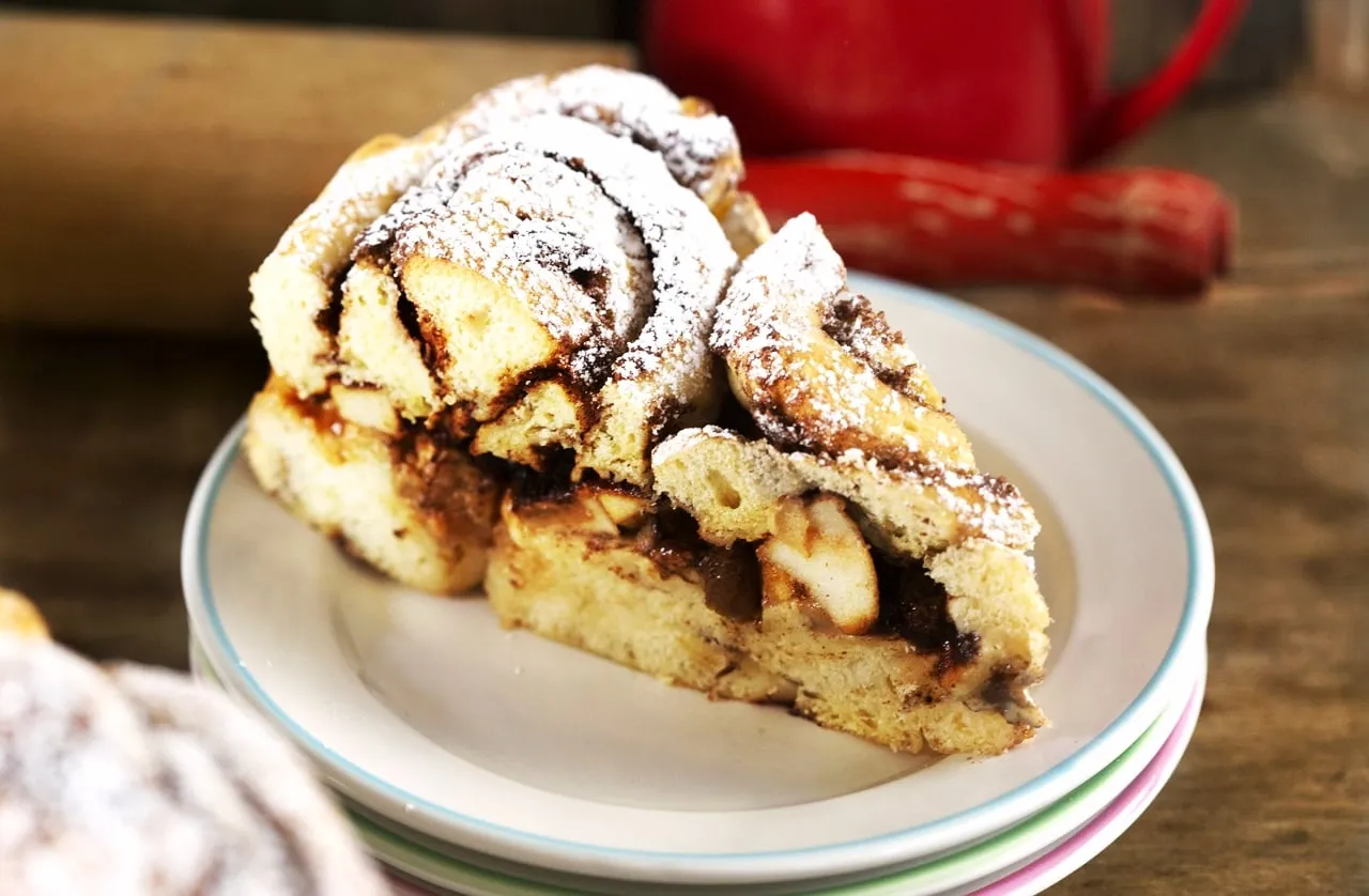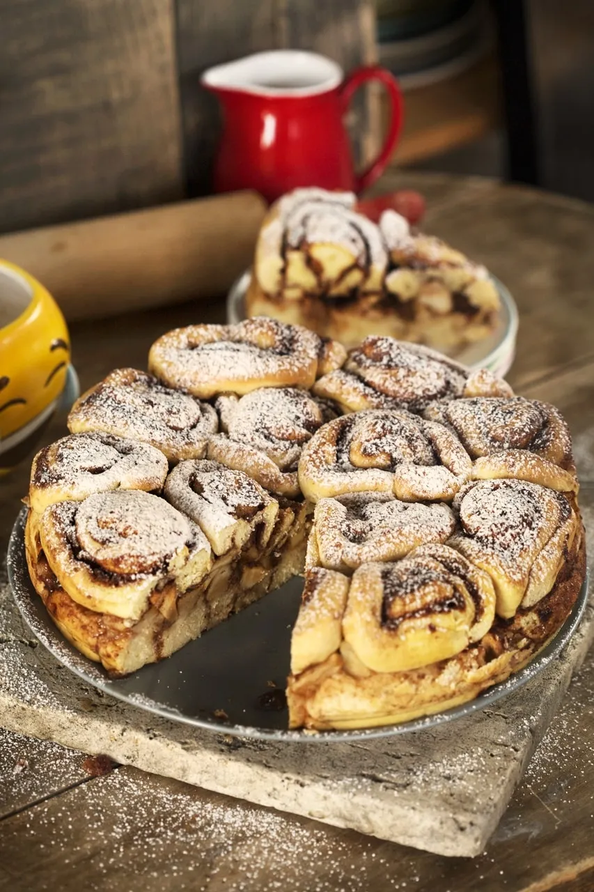 A fahéjas töltelékhez összekeverjük a hozzávalókat, rákenjük a tésztára, a hosszabb oldalánál szorosan feltekerjük és kb. 1-1,5 cm-es szeletekre vágjuk. A csigákat egymás mellé rakjuk, kicsit kinyújtjuk őket, majd egy tortaformába rakjuk a csigák felét. Erre rászórjuk a meghámozott, kockákra vágott almákat, megszórjuk porcukorral, fahéjjal és ennek a tetejére nyomkodjuk a fahéjas csigát másik felét. 180 fokos sütőben kb. 35-40 percig sütjük és porcukorral megszórva tálaljuk.