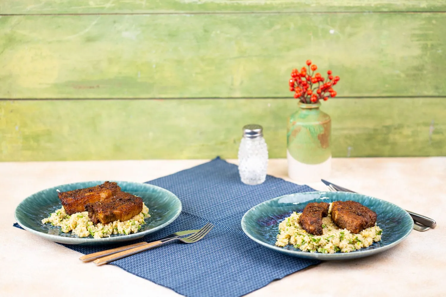 Közben a salihoz egy edényben bő, sós vízben megfőzzük egyszerre a quinoát és a vöröslencsét. Mindkettőnek ugyanannyi idő kell, kb. 15-20 perc, úgyhogy ha megpuhultak, leszűrjük, és még melegen egy tálban hozzákeverjük a vajat, és sózzuk, borsozzuk. Ha kihűlt, megszórjuk a felaprított zöld fűszerekkel, belefacsarjuk a citromlevet, és az oldalas mellé tálaljuk.