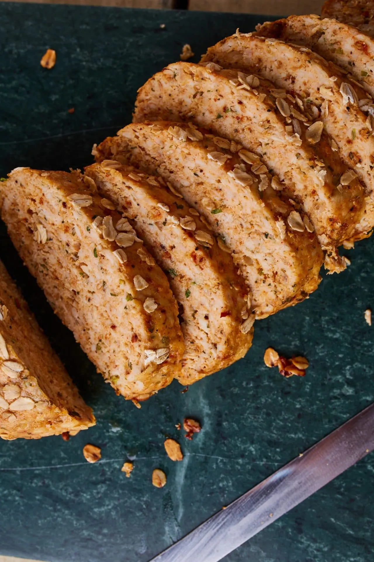 A zöld fűszereket finomra aprítjuk, majd minden alapanyagot alaposan összedolgozunk egy keverőtálban. A csirkés masszánkból rudat formálunk, és megszórjuk a tetejét 1 evőkanál zabpehellyel. Egy sütőpapírral bélelt tepsire tesszük, és 190 fokra előmelegített sütőben 35-45 perc alatt készre sütjük. Tökéletes magában is, de egy diétás, saját magával sűrített főzelék mellé is kiváló.