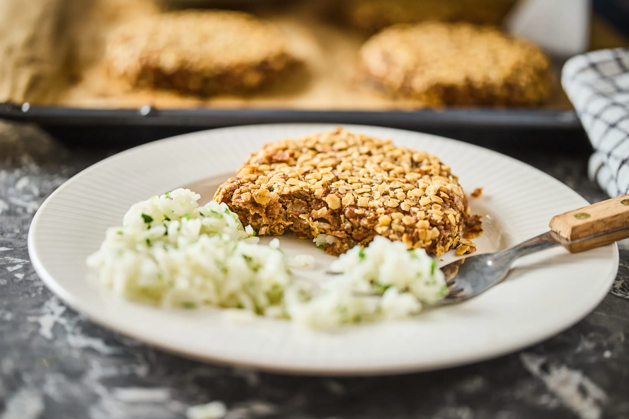 A masszából 8 db egyforma pogácsát formázunk és meghempergetjük a maradék zabpehelyben. Zsírpapírral bélelt tepsire pakoljuk őket és betesszük a 200 fokra előmelegített sütőbe 15 perce. Ha megsültek, már tálalhatjuk is egy kis petrezselymes párolt rizzsel.