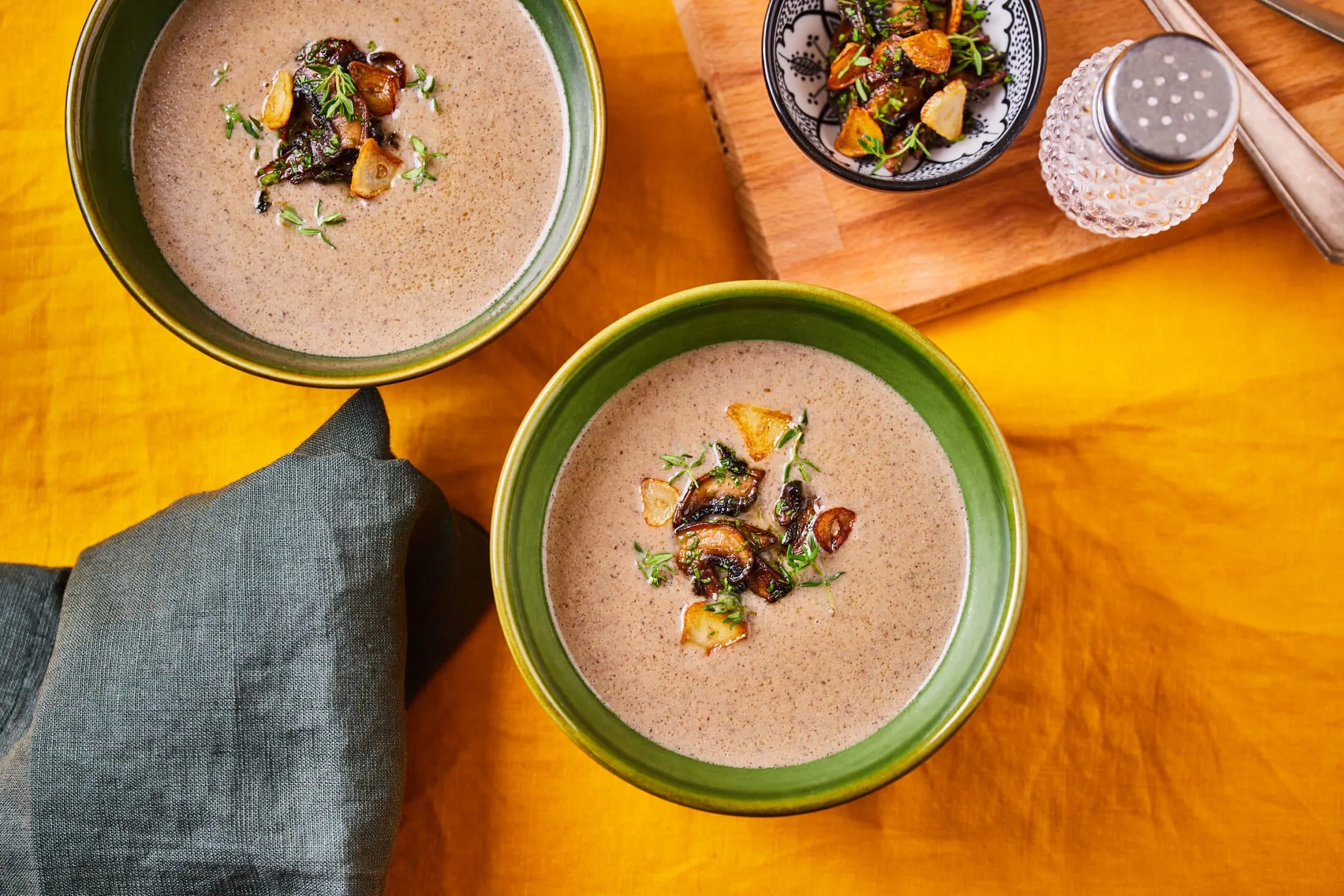 A hagymás gombás alapra ráöntjük a fehér bort és elpárologtatjuk, majd hozzáadunk a tejszínt és a vizet. Sózzuk, borsozzuk, és kakukkfűvel ízesítjük. Az egészet 10 percig kis lángon rotyogtatjuk. 5 percen keresztül folyamatosan turmixolva szép krémes levest csinálunk belőle. Tálalásnál tányérba szedünk a krémes levesből, a tetejére pedig rápakoljuk a petrezselymes, fokhagymás, pirított gombát.