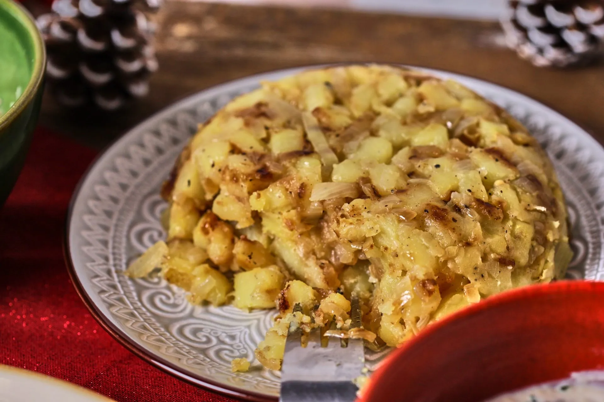 A serpenyős krumplihoz a burgonyát 1,5-2 cm vastag szeletekre, majd kisebb kockákra vágjuk. Egy serpenyőt felforrósítunk, belelocsolunk 2 ek olajat, rádobjuk a krumplit, megsózzuk, borsozzuk és “megszerecsendiózzuk”. Az egészet átforgatjuk, felöntjük a vízzel, és néha átkeverve addig pároljuk, amíg a víz eltűnik, és a krumpli sercegni kezd. A hagymát finomra vágjuk, majd a krumplihoz adjuk, és addig pirítjuk néha átkeverve, amíg teljesen megpuhul, és kicsit lepirul. Ha ezzel megvagyunk, egy tálat kikenünk 1 ek olajjal, a krumplit átszedjük bele, és lenyomkodjuk.