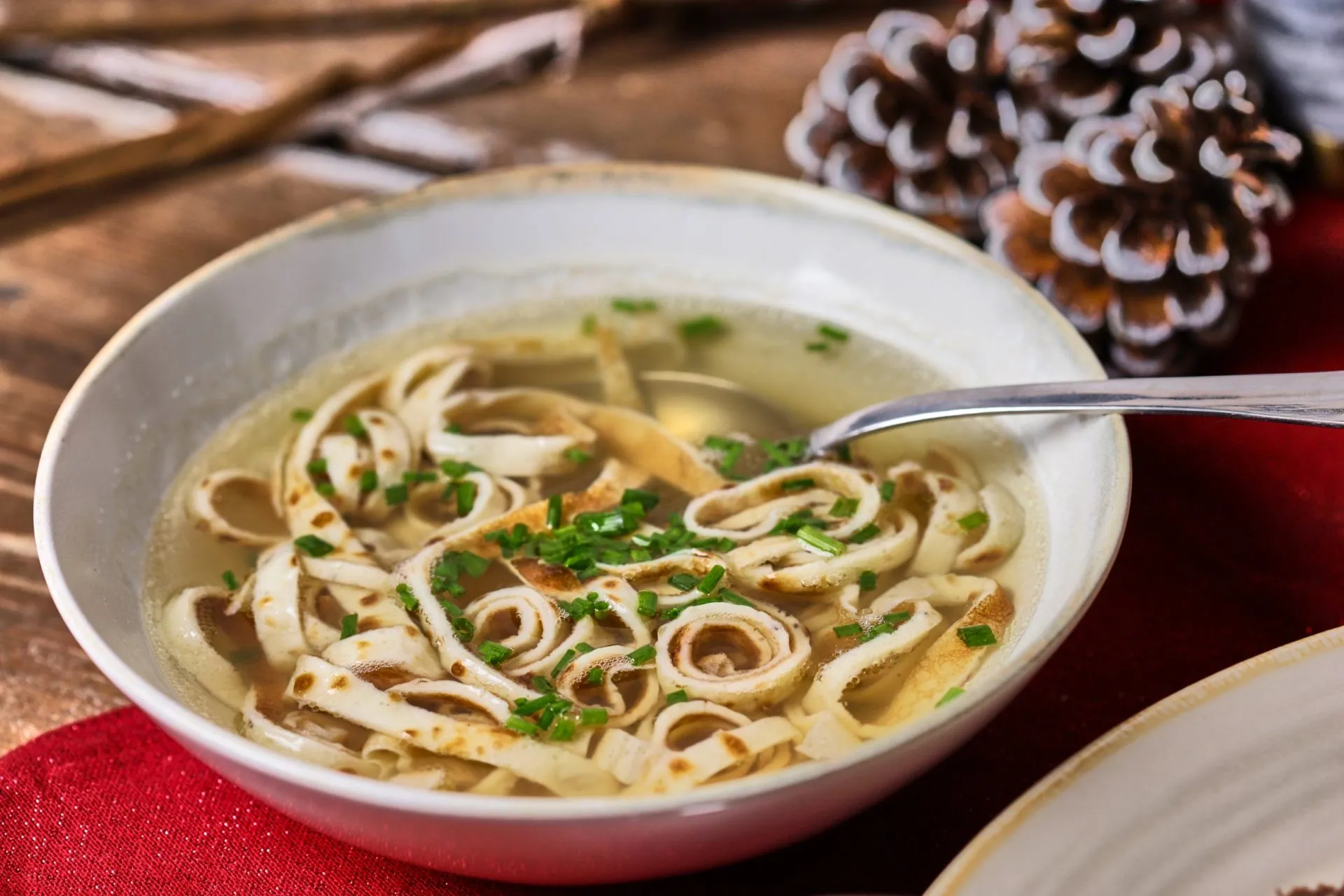 Egy mélyebb tálba szedjük a “levet”, egy laposat használunk a húshoz, és egy másik laposat a zöldségekhez. A csontokat egy alternatív tálba gyűjtjük, első körben biztosan nem tálaljuk ki, de azért akad rajta elég cuppogtatnivaló. A krumplit egy meleg lapos tányérra borítjuk, elővesszük a hűtőből a tormás almát és a remuládot, és már jöhetnek is a vendégek. Előételnek szedünk a levesből, beleszórjuk a feltekert palacsintából vágott csíkokat és egy kevés aprított snidlinget.