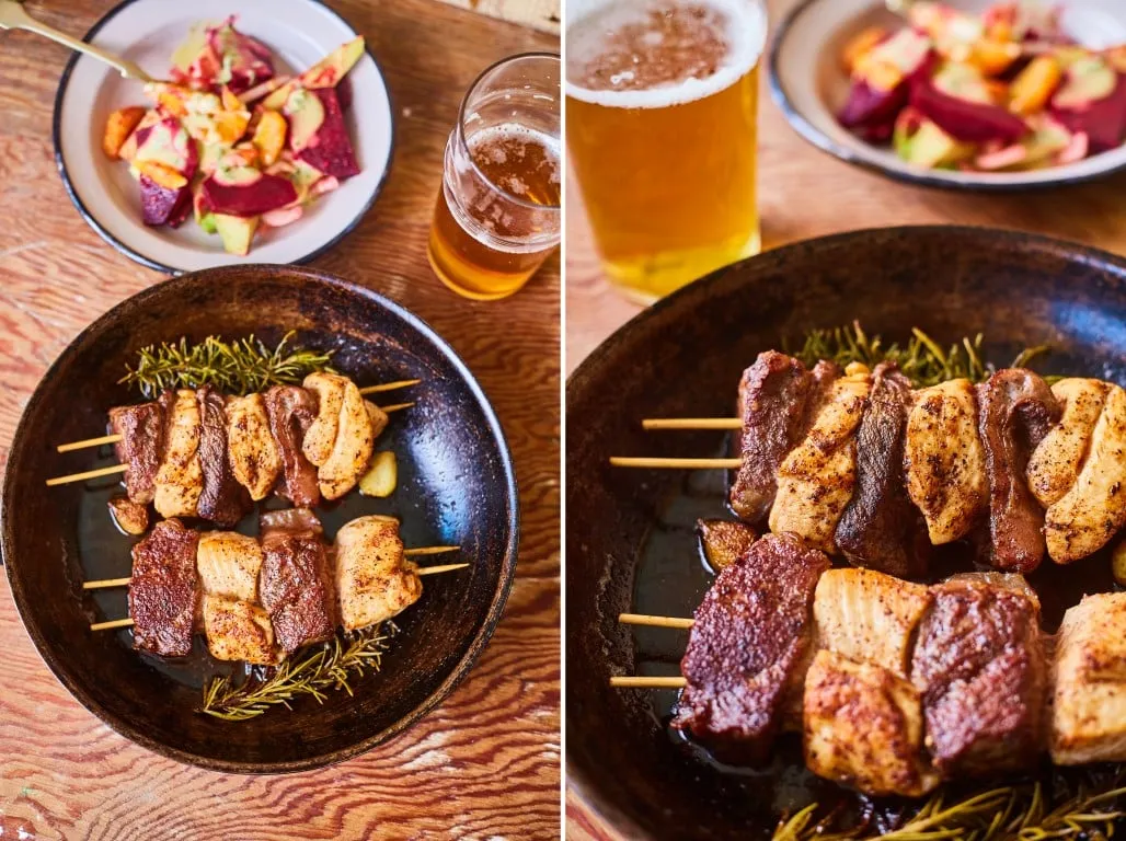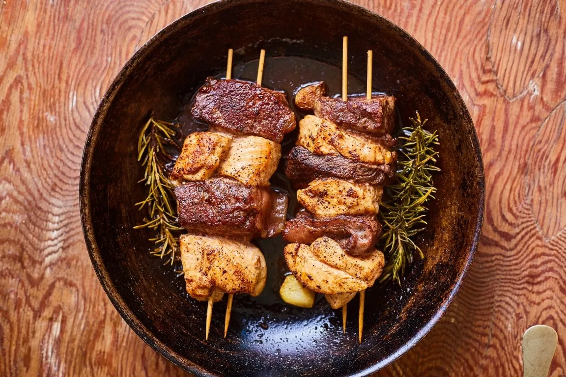 A húsokat egyenlő nagyságú vastagabb darabokra vágjuk és váltakozva – egy csirke-egy marha – nyársra húzzuk őket. Nyársanként 2-2 darab hússal számolunk. Teszünk rá egy kevés olajat, alaposan sózzuk, borsozzuk, majd állni hagyjuk. Fontos hogy mindig szobahőmérsékletű legyen a hús, amit használunk. Felhevítünk egy vas serpenyőt és beledobjuk a nyársakat. Oldalanként 2-2 percig sütjük, fél percenként forgatva őket. Félidőben rátesszük a vajat, mellé dobjuk a késsel összenyomott fokhagymát és a friss rozmaringot. Amikor szép kéreg sült a húsra, áttesszük a 150 °C fokra előmelegített sütőbe és 10 percig sütjük. Kivesszük és 3-5 percig még pihentetjük a húst.