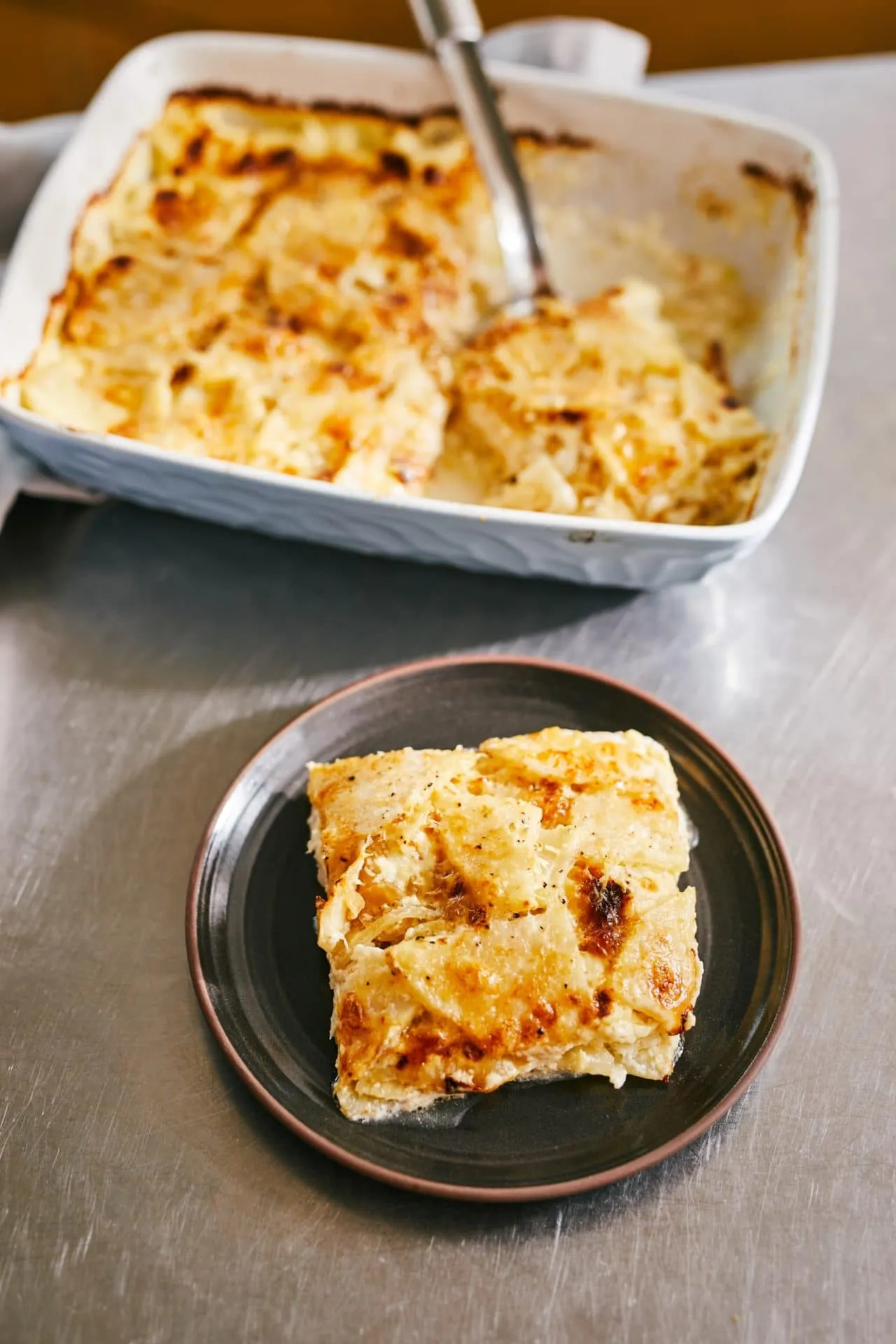 A tepsit enyhén kiolajozzuk. Az aljára rakjuk a zeller harmadát. Ráöntjük a tejszín harmadát, ráreszeljük a parmezán harmadát, megszórjuk borssal és rárakjuk a hagymás keverék felét. Ezután újabb réteg zeller, hagyma, parmezán, bors és tejszín következik. A legvégén rárakjuk a maradék zellert, tejszínt, megborsozzuk, és ráreszeljük a parmezánt. 180 fokra előmelegített sütőben 30 percig sütjük, majd 200 fokon addig, amíg kicsit meg nem pirul a teteje.