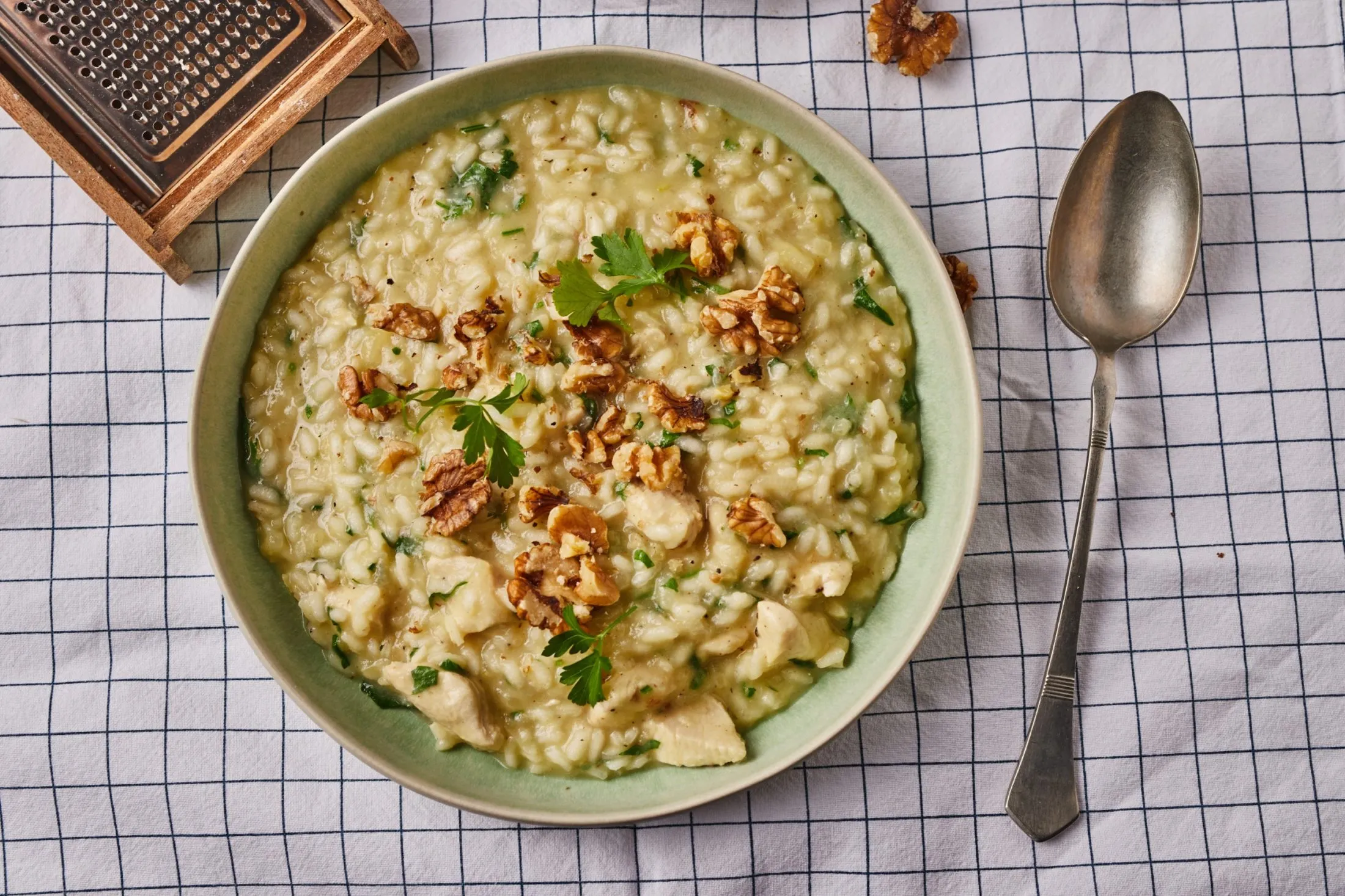A végeredménynek egy nagyon krémes állagot kell kapnunk. Ízlés szerint sózzuk, borsozzuk, beleszórjuk a szerecsendiót, és meghintjük a reszelt parmezánnal és az aprított petrezselyemmel. Elkeverjük, és tálaláskor megszórjuk még dióval.
