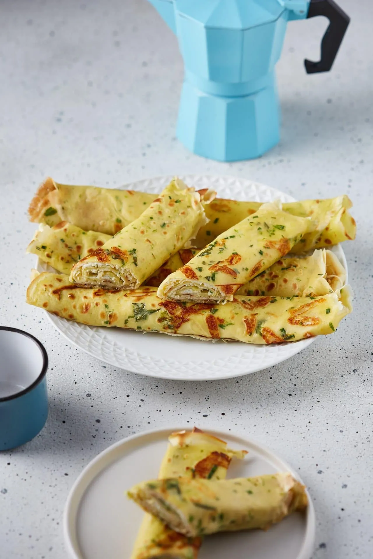 Zöld fűszeres sajtkrémmel töltött sajtos palacsinta