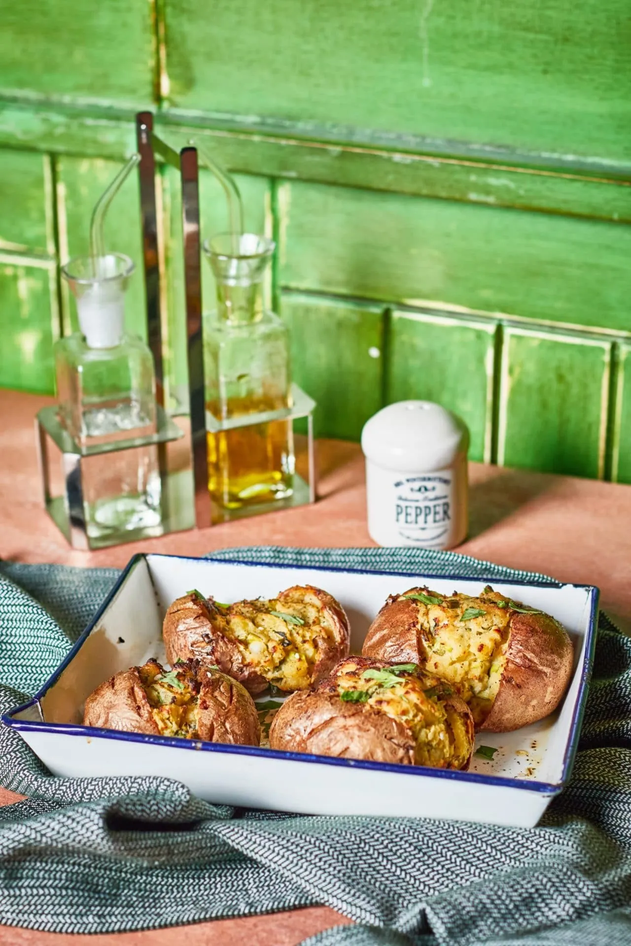 Amint a krumplik kissé kihűltek, félbevágjuk (de nem vágjuk át teljesen), majd egy mélyebb tálba kanalazzuk a belsejüket. Ehhez hozzáadjuk a vajat, a feta sajtot, a hagymát, a tárkonyt, a fokhagymát és az édesköményt, és egy villával alaposan összetörjük. Ha nem elég sós, akkor még ízesítjük. Az elkészült tölteléket beletöltjük a krumplihéjakba, és visszatesszük a 200 fokra előmelegített sütőbe további 20-30 percre, amíg a sajt megpirul a tetején. Forrón, friss salátával tálaljuk.