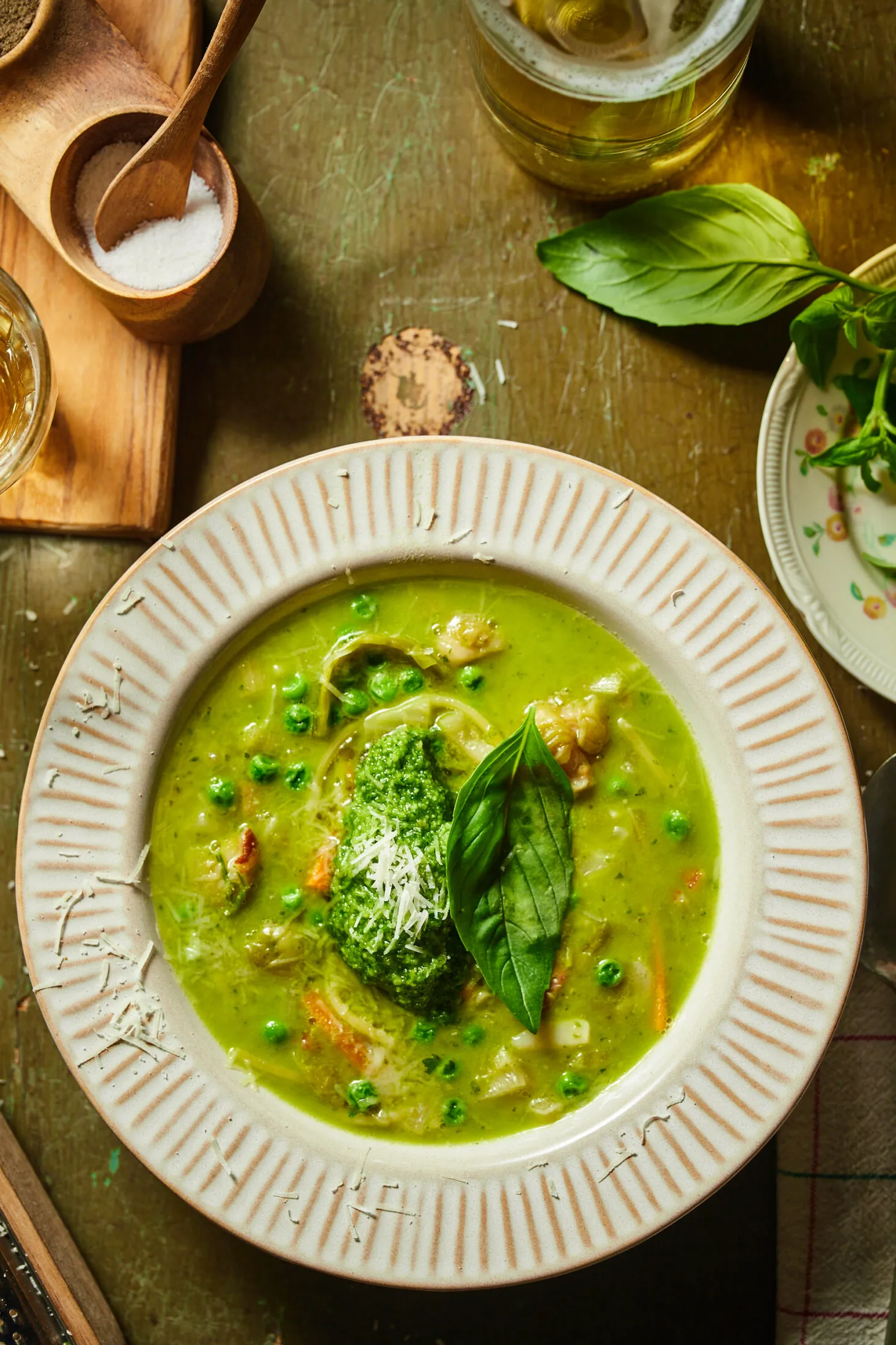 A levest sóval, borssal ízesítjük és hozzáadjuk a maradék zöldségeket: a zöldborsót, a zöldséghámozóval vékonyra szeletelt sárgarépát és a kelbimbóleveleket. Éppen csak addig főzzük, amíg ezek a zöldségek megpuhulnak.