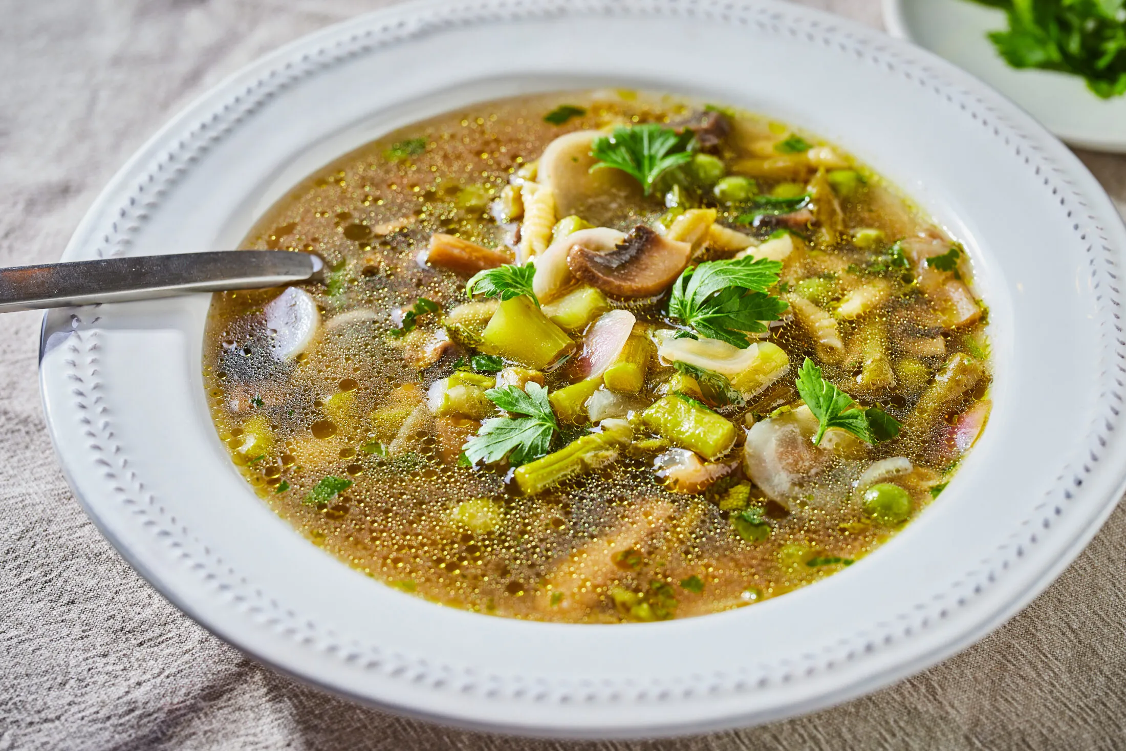 Ezután hozzáadjuk a zöldborsót, a lecsepegtetett zöldbabot, a vékony szeletekre vágott retket, a tésztát, valamint a finomra vágott mentát és petrezselymet. Ha megfőtt a tészta, kész is vagyunk! Tálalásnál pár levél petrezselyemmel díszítjük.