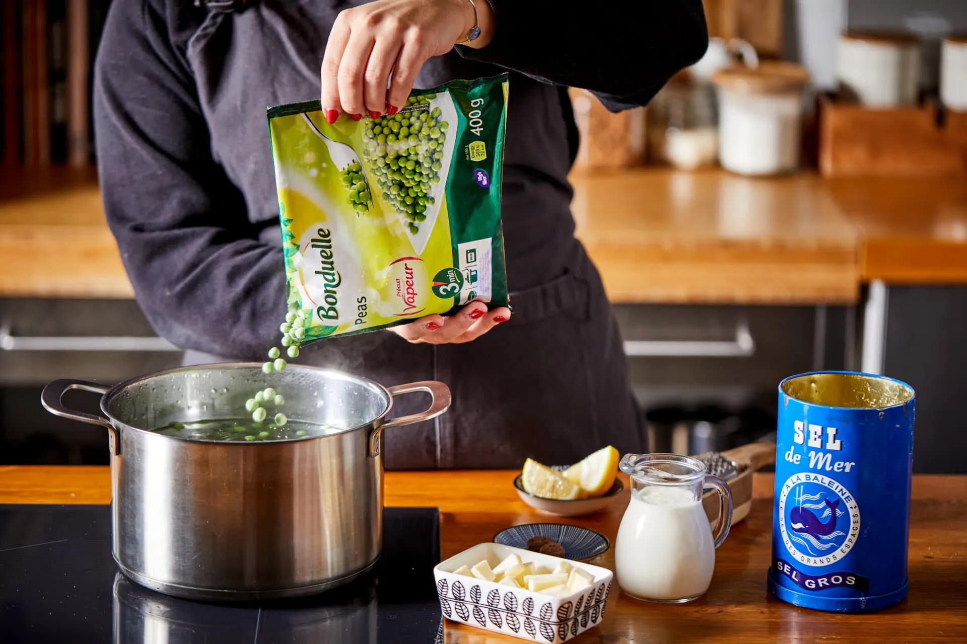 Amíg sül a csirke, a püréhez a borsót sós, lobogó vízbe dobjuk, és ha újra felforrt, 2-3 perc főzés után leszűrjük, majd hagyjuk szoba-hőmérsékletűre hűlni. Ezután a többi hozzávalóval leturmixoljuk.