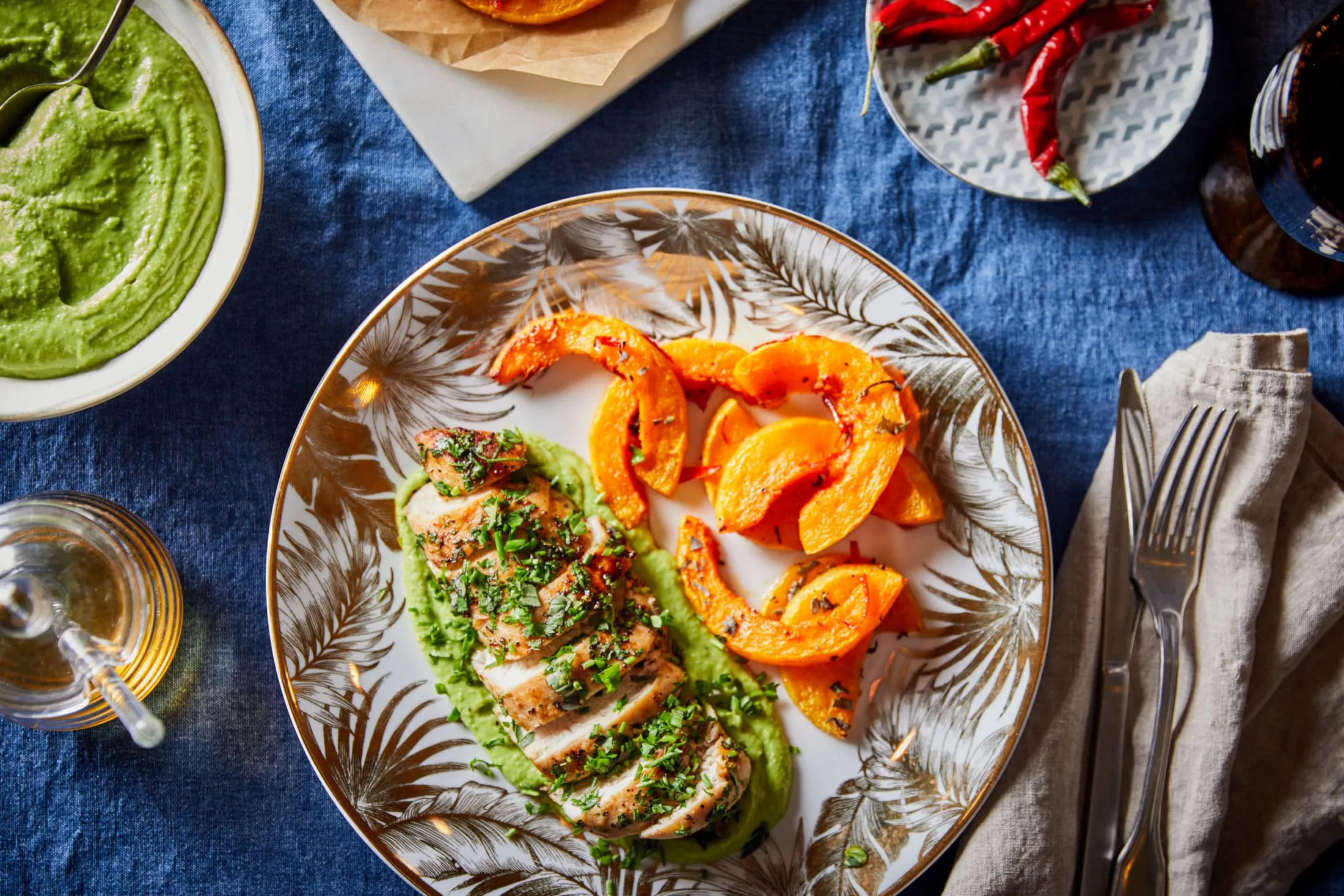 A felszeletelt húst a borsópürével és a sült sütőtökkel tálaljuk.