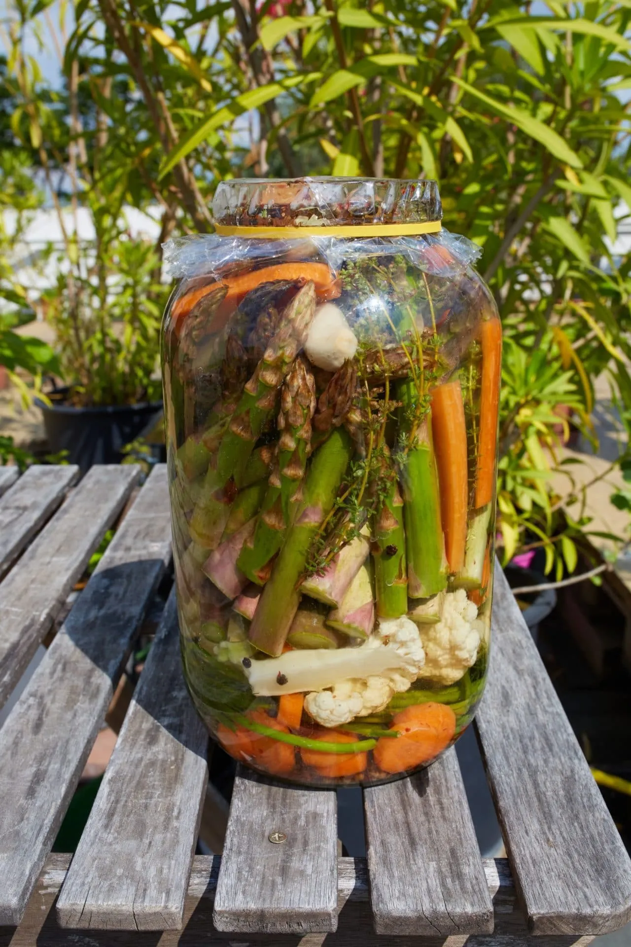 A burgonyát héjában megfőzzük, majd félretesszük kihűlni. A sárgarépát és a paszternákot tisztítás után felszeleteljük, a spárga fás részét eltávolítjuk – ebből még krémlevest is csinálhattok. A karfiolt és a brokkolit is kisebb darabokra vágjuk. Az üveg aljára teszünk egy csokor kaprot, az egész borsot, valamint a fokhagyma és a zöldségek felét. Erre mennek a spárgák, fejjel felfelé, ahol hely van.
