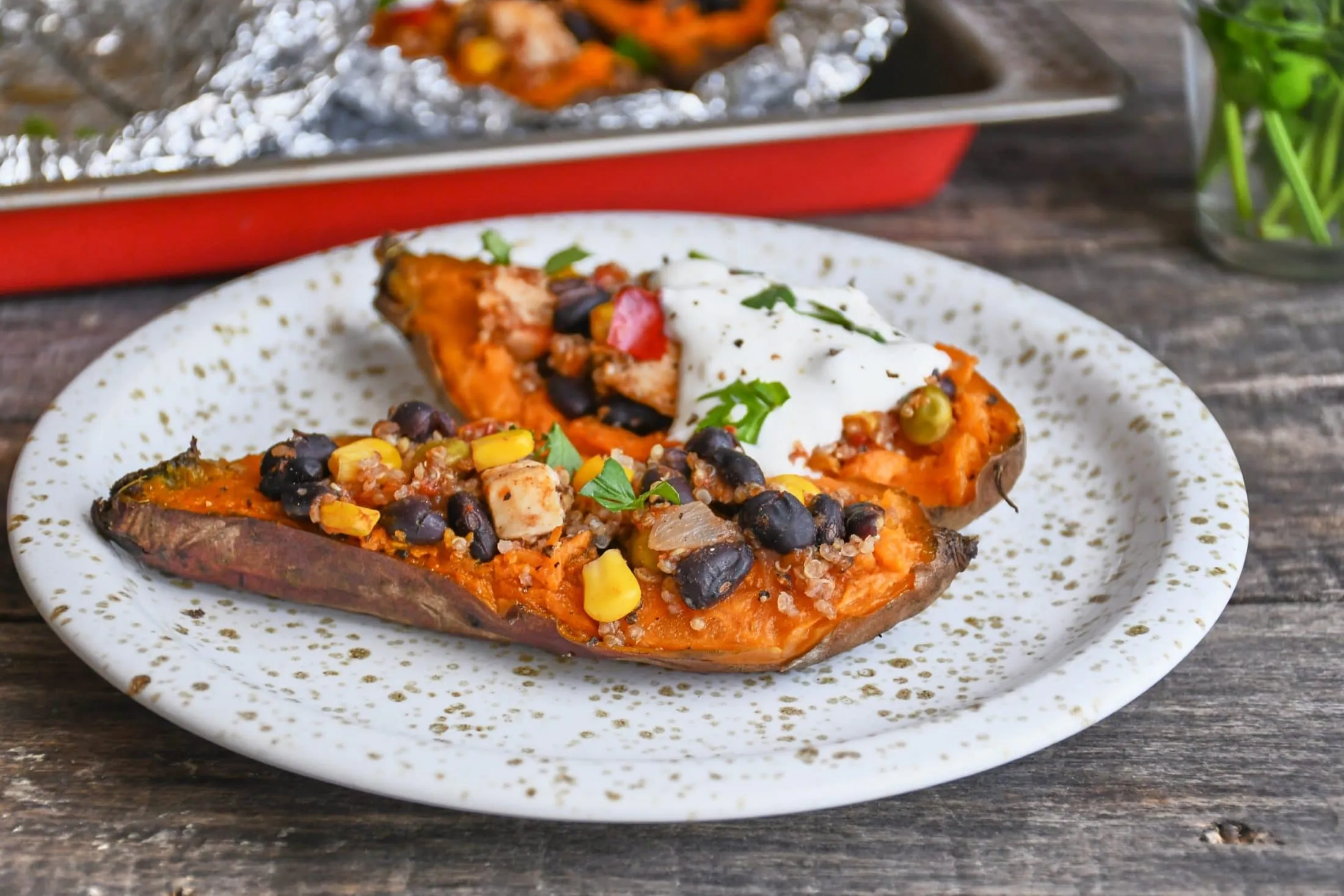 A burgonyákat alaposan megmossuk, áttöröljük és becsomagoljuk 1-1 darab alufóliába, majd mehetnek is a 180 fokra előmelegített sütőbe kb. 40 percre (burgonya nagyságától is függ). Közben a quinoát felöntjük bővebb, enyhén sós vízzel, puhára főzzük, majd leszűrjük.