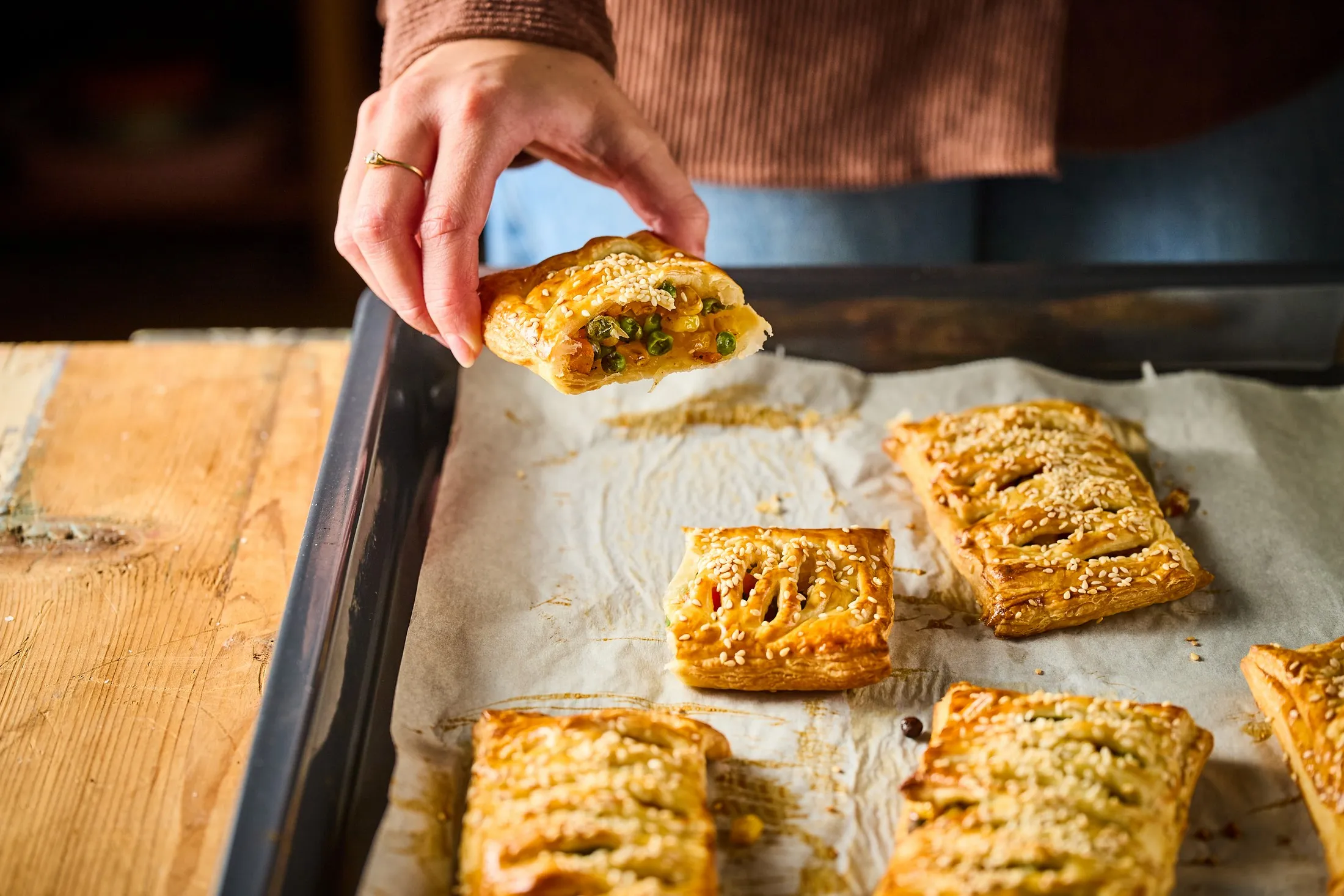 5 darab tésztalap közepébe kanalazzuk a ragut. Ügyeljünk rá, hogy a tészta szélétől maradjunk el kb. 0,5 cm-re, hogy a tészta össze tudjon tapadni majd a másik tésztával, ami rákerül. A másik 5 tésztalapot egy rácskészítő kézi készülékkel keresztben berácsozzuk. Ha nincs ilyenünk, akkor egy késsel rácsokat vágunk a tésztára, kissé kihúzkodjuk és ráhelyezzük a töltelékes tésztára. A széleit lenyomkodjuk, megkenjük felvert tojással, megszórjuk a szezámmaggal és a 200 fokra előmelegített sütőben 12 perc alatt készre sütjük.