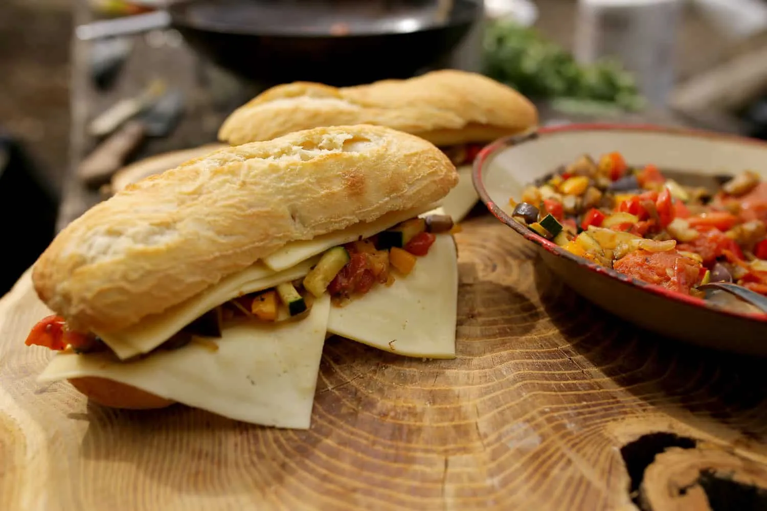 A félbevágott bagett aljára teszünk két szelet gouda sajtot, erre kanalazunk a zöldségraguból, majd rápakoljuk a kolbászt. A tetejére teszünk még 2 szelet sajtot, majd a bagett tetejével zárjuk a sort.