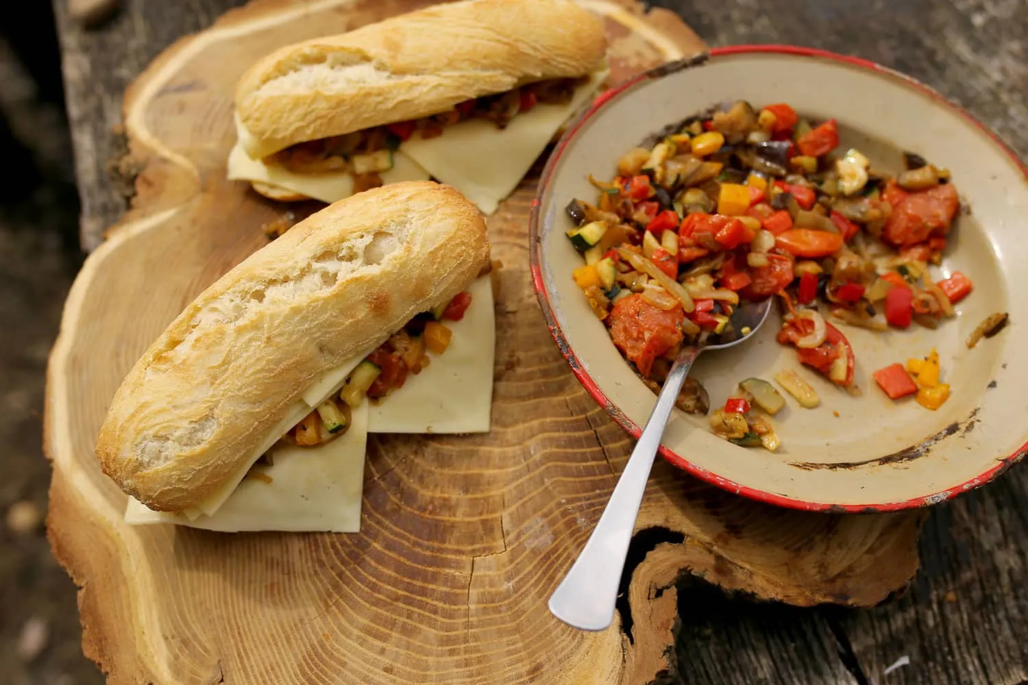 A zöldségragus bagett recepthez először elkészítjük a ragut: a hagymát és a fokhagymát vékonyra szeleteljük, majd az olajon közepes lángon elkezdjük hőkezelni. Ha kellően üveges, rádobjuk a felkockázott zöldségeket: a padlizsánt, a cukkinit, a kaliforniai paprikát és a koktélparadicsomot.