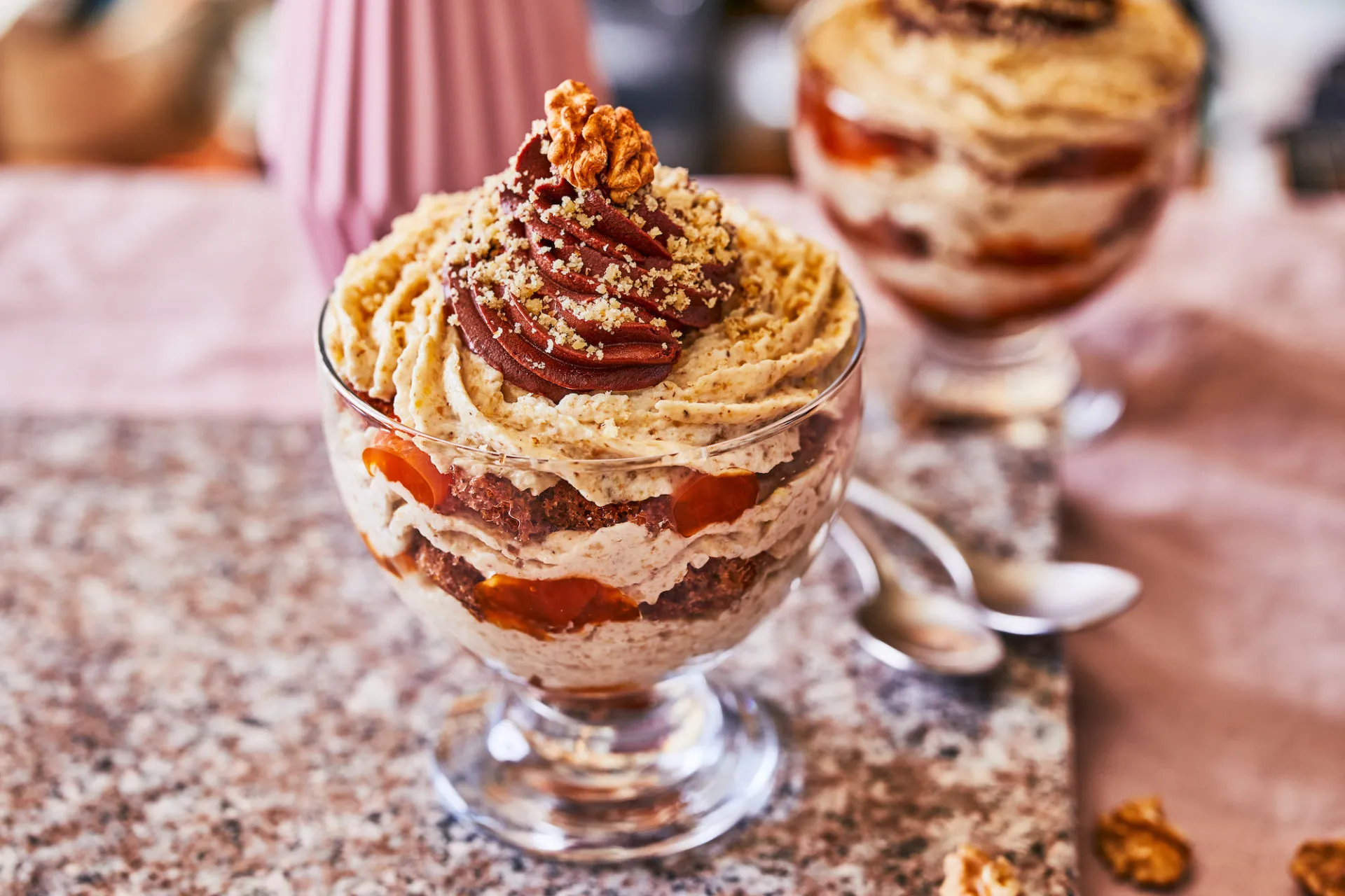 A csokikrémhez a felmelegített tejszínt ráöntjük a feldarabolt csokira, majd kihűtjük. Ha hideg a krém, 2 perc alatt kihabosítjuk egy habverővel, és ezt is egy habzsákba töltjük. Végül 4 kisebb pohárba rétegezzük az összetevőket: piskóta-lekvár-diós krém így ebben a sorrendben, amíg el nem fogynak, a végén pedig rányomjuk a csokikrémet, illetve megszórjuk egy kevés darált dióval, és a tetejét egész dióval díszítjük.