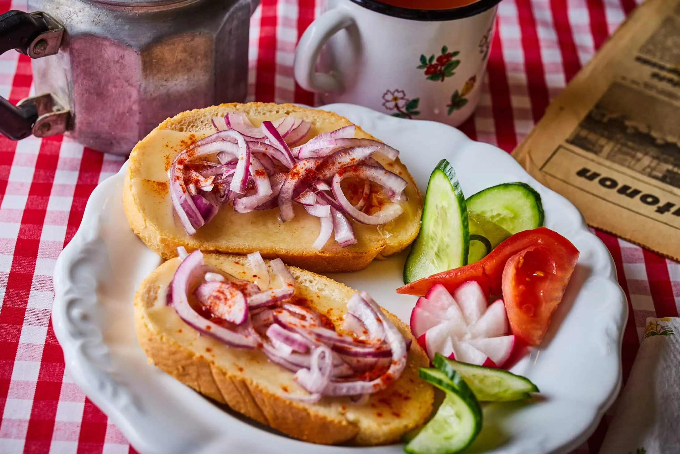 A kenyereket megkenjük a szoba-hőmérsékletű zsírral, majd a még impozánsabb és még ízletesebb végeredményért cserében megszórjuk a fűszerpaprikával, és ráhelyezzük a korábban lesózott, majd félrerakott lila hagymát is. A forró, de nem forrásban lévő, mag nélküli teával szervírozzuk.