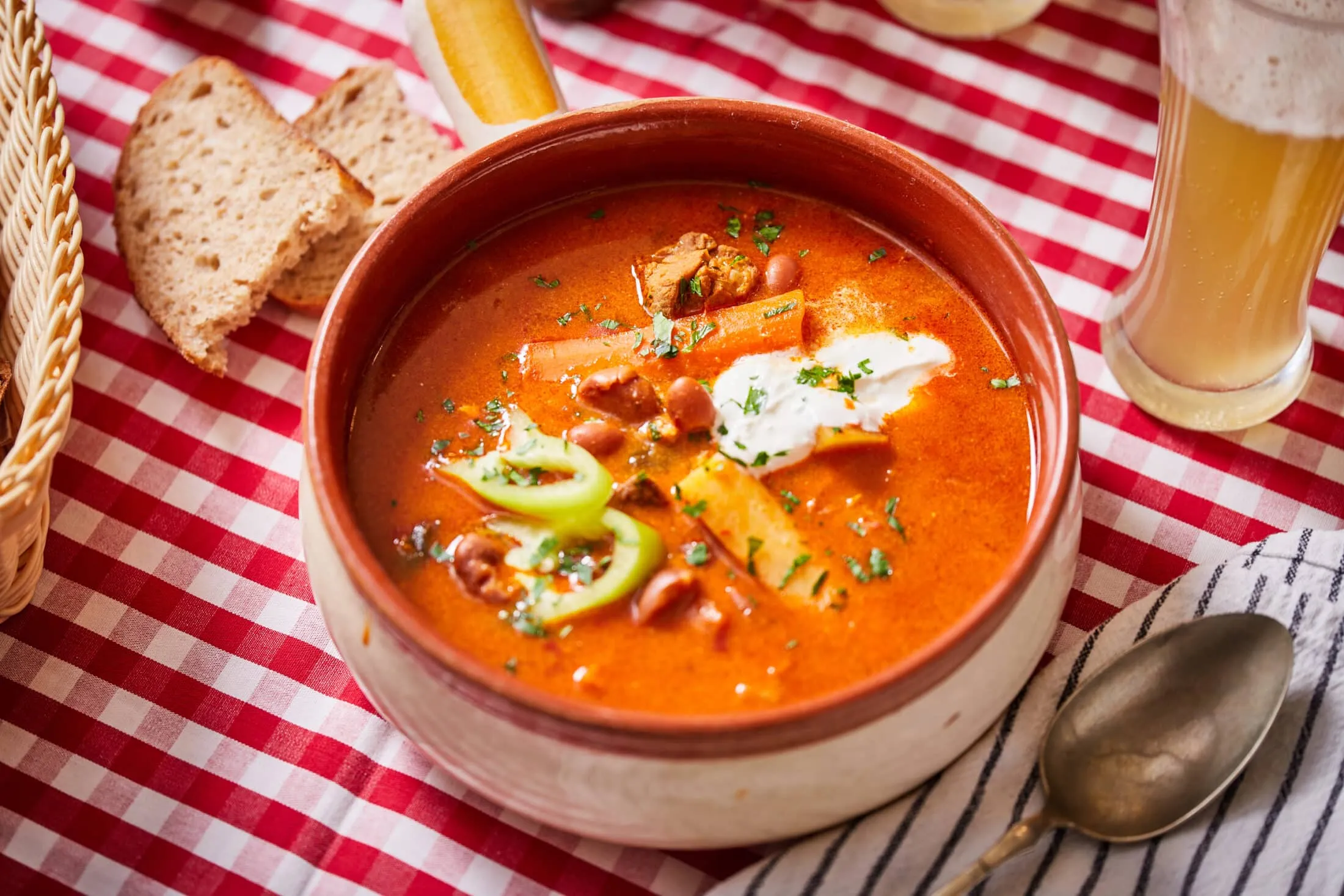 Amikor a hús szinte teljesen puha, hozzáadjuk a kb. 5 centis hasábokra vágott sárga- és fehérrépát és a szintén hasábokra vágott zellert is. Beletesszük a levesbe a mustárt is, és amikor a zöldségek elkezdenek megpuhulni (5-10 perc), mehet a fazékba a kb. 2 centis kockákra vágott krumpli is. Addig főzzük a levest, amíg a zöldségek és a hús teljesen meg nem puhulnak. Ez az idő kb. 15 perc. Ekkor hozzáadjuk a lecsöpögtetett babkonzervet is, majd behabarjuk a levest.