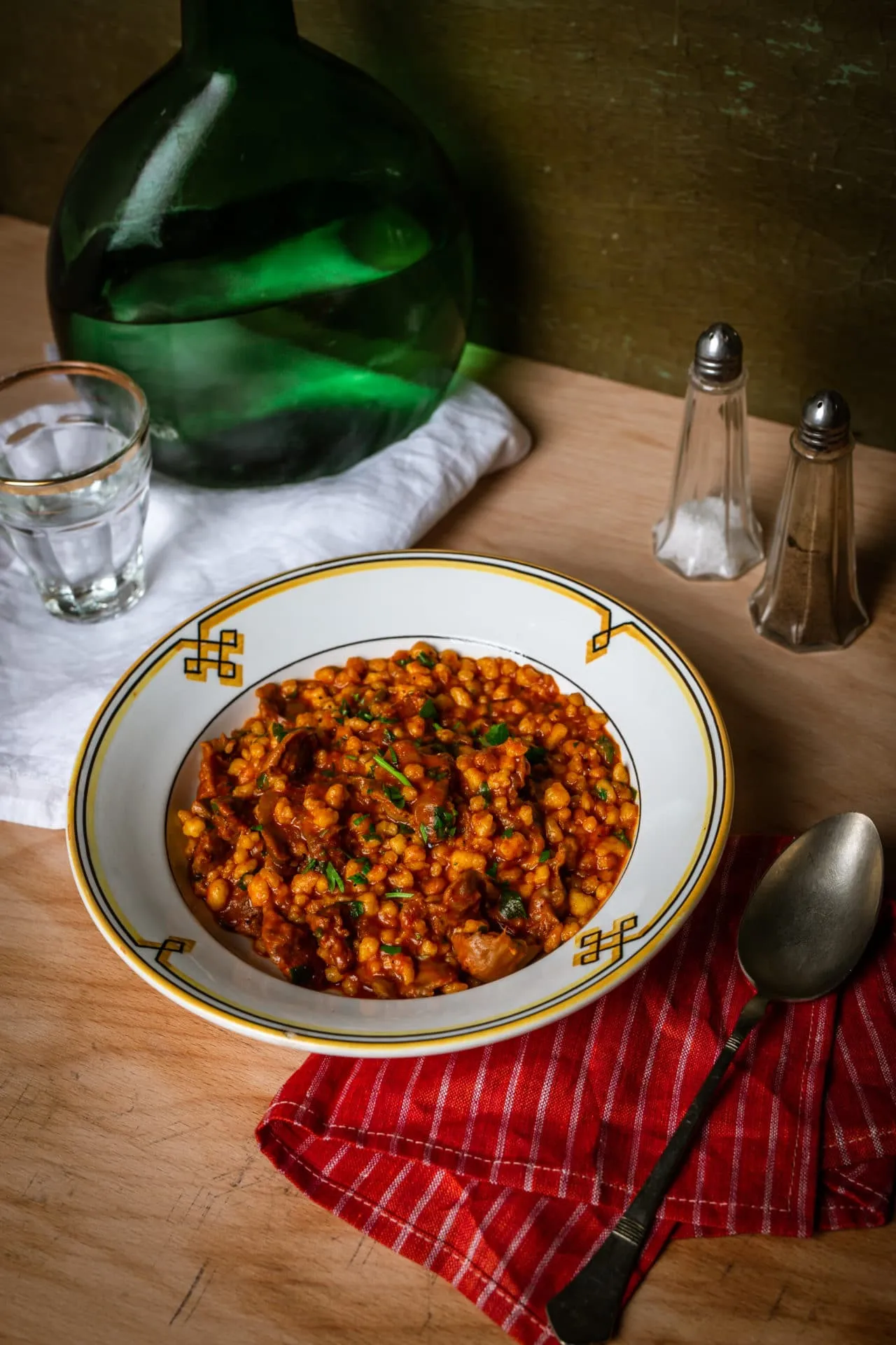 A finomra vágott hagymát, fokhagymát és paprikát lepirítjuk az olajon, félrehúzzuk, majd hozzátesszük a paradicsomot, a köményt, a pirospaprikát, sózzuk, borsozzuk, és elkeverjük. Jöhet bele a zúza, az alaplézselé és a víz, és addig főzzük, amíg a zúza megpuhult, a leve jócskán elfőtt, de még van rajta. Beleöntjük a tarhonyát, puhulásig főzzük lassú tűzön, amíg szinte teljesen felvette a maradék levet. Megszórjuk aprított petrezselyemmel, és tálaljuk.