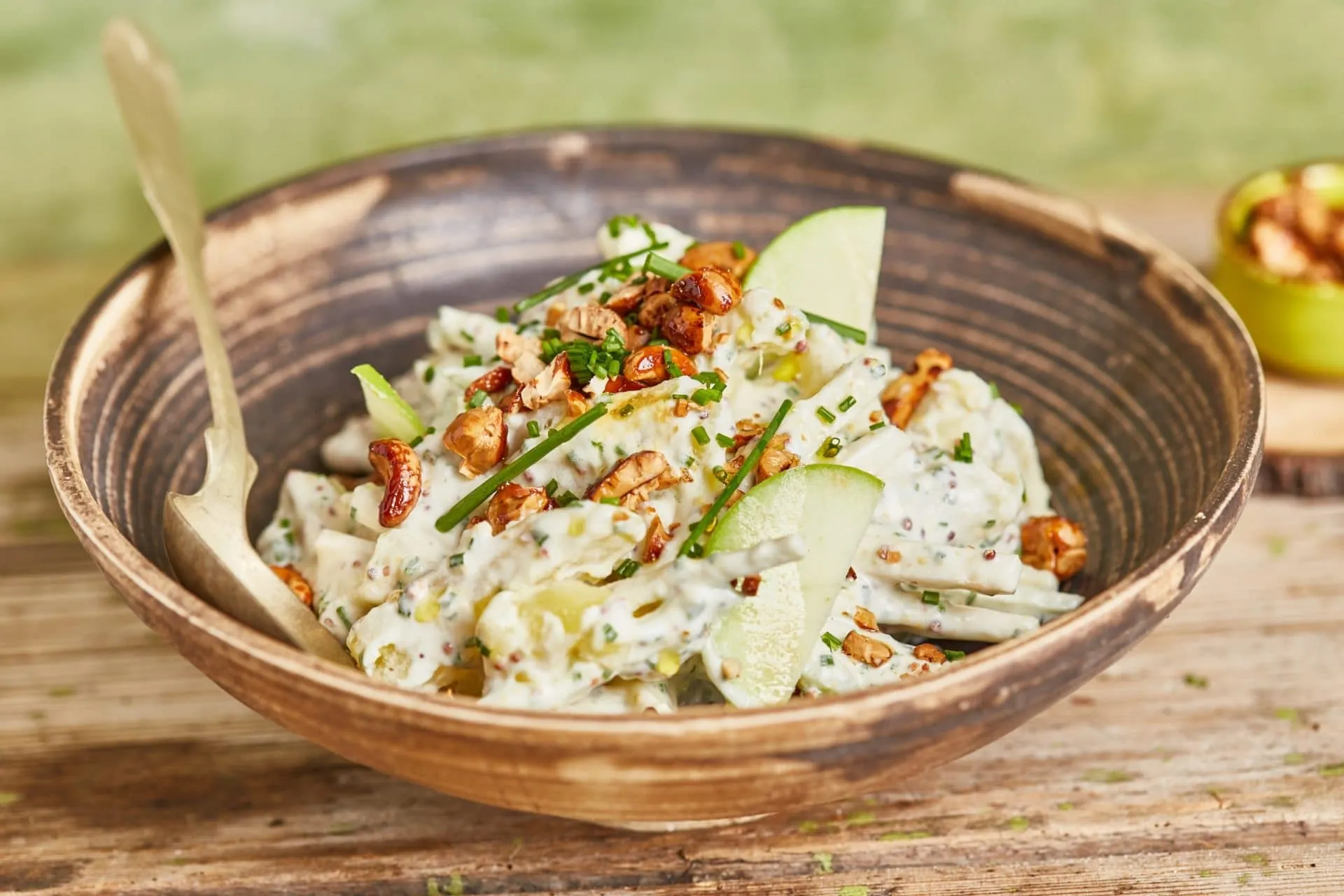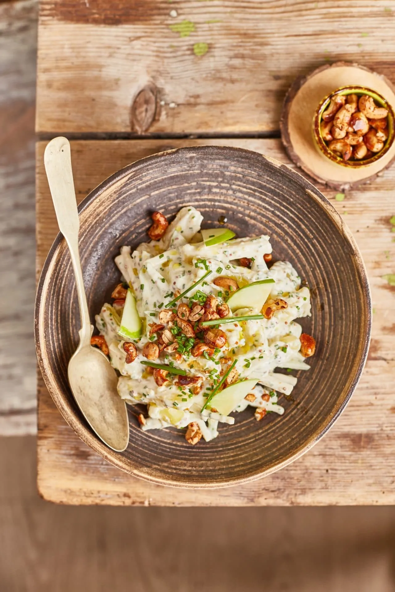 Az eddig elkészített alapanyagokat összekeverjük, majd tálalásnál megszórjuk a salátát a mézes, pörkölt kesudióval.