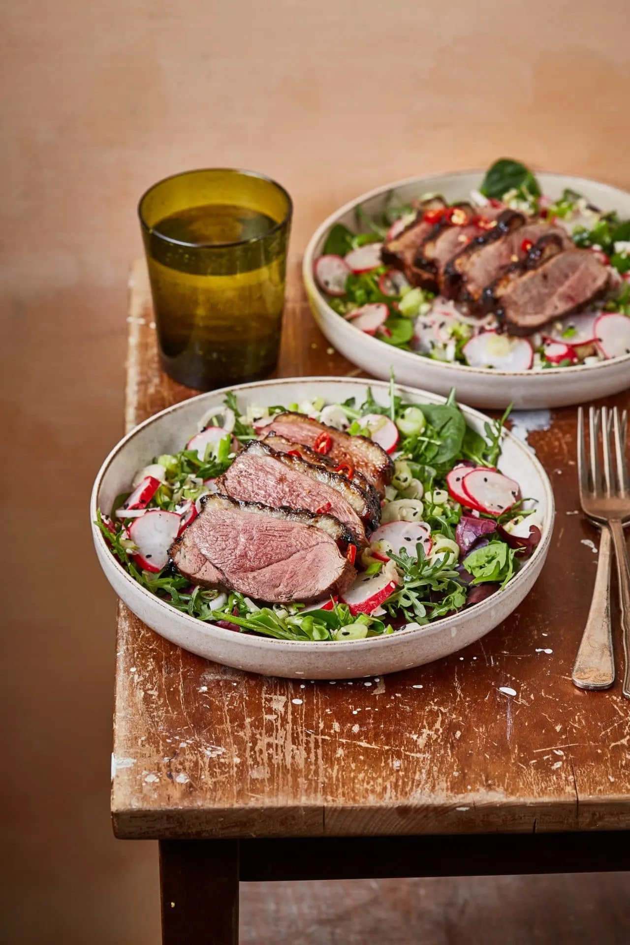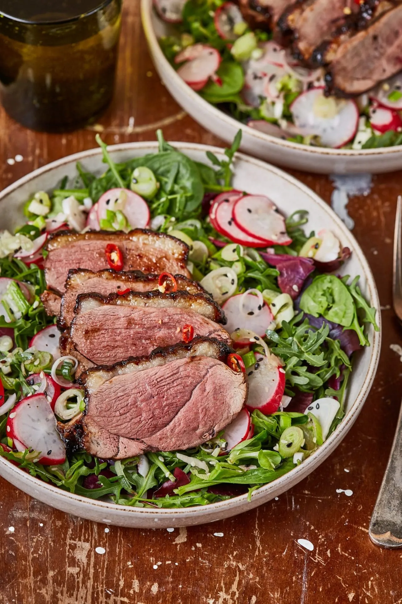 A máz hozzávalóit egy serepenyőbe rakjuk, beleöntjük a szójaszószt, amiben a kacsa pácolódott, és 5 percig forraljuk, hogy besűrűsödjön. A kacsa bőrét beirdaljuk, és hideg serpenyőben, bőrrel lefelé kezdjük sütni, közepes hőfokon. Amikor elkezd kiolvadni a zsírja, leöntjük róla. 5 percig így pirítjuk, majd felkapcsoljuk a legmagasabb fokozatra a hőt, és 2 perc alatt jól rásütünk. A felesleges zsírt, ami kisül, szintén leötnjük róla. Ezután megfordítjuk, és a másik oldalát is 3 percig pirítjuk. Sütőpapírral bélelt tepsire rakjuk, bőrrel felfelé, lekenjük a máz egy részével, és 200 fokra előmelegített sütőben 7 percig sütjük. Megfordítjuk, lekenjük a maradék mázzal, és 13 perc alatt készre sütjük. Ha megsült, tegyük át egy tányérra, és hagyjuk addig állni, amíg összedobjuk a salit.