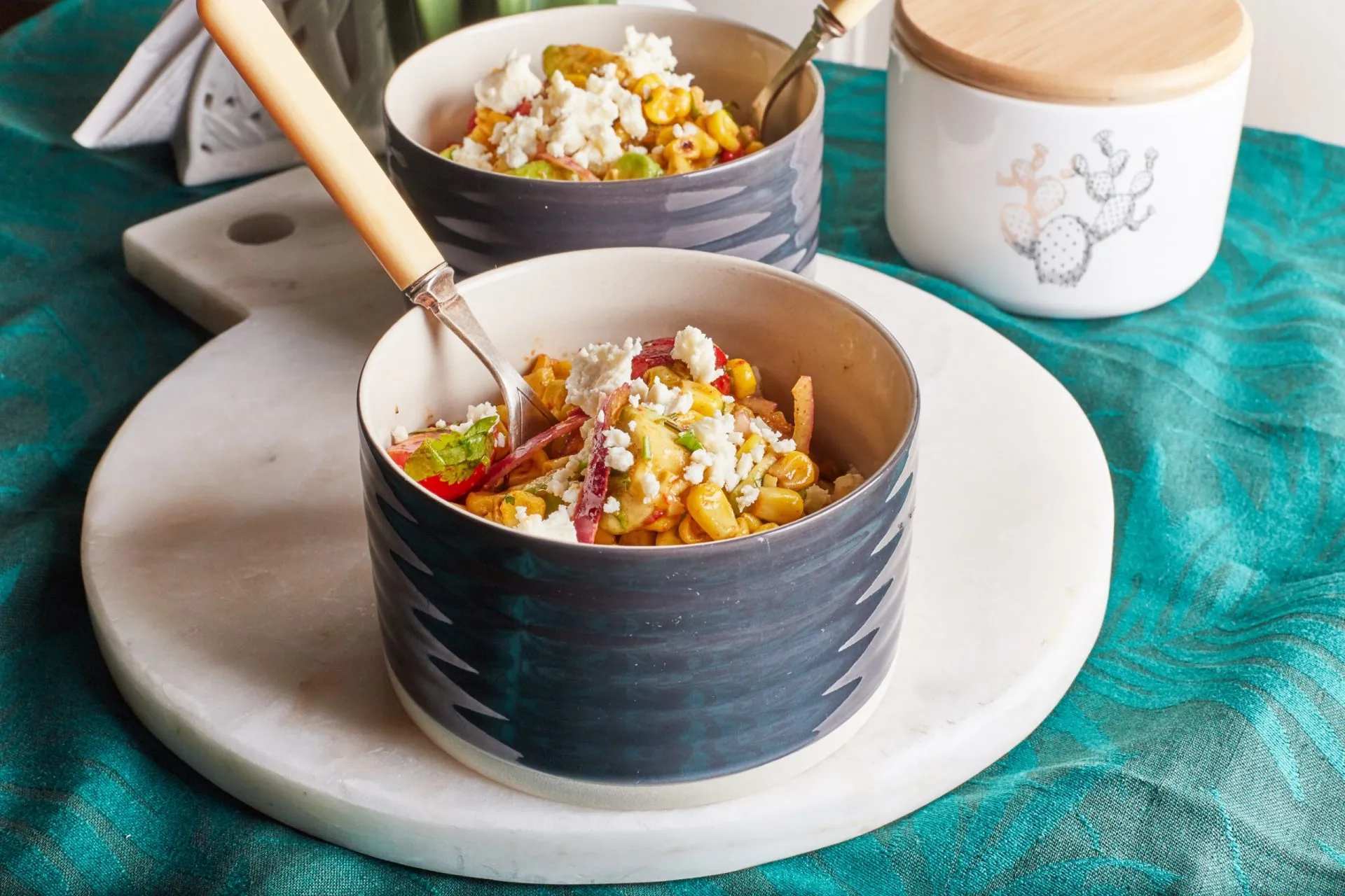 Egy nagy keverőtálba rakjuk a pirított kukoricát, a sült paprikát, az avokádót, a paradicsomot, lilahagymát, felaprított jalapeno paprikát, koriandert és összeforgatjuk a maradék olívaolajjal és a lime másik felének a levével. Tálakba szedjük és rámorzsolunk egy kis fetát.