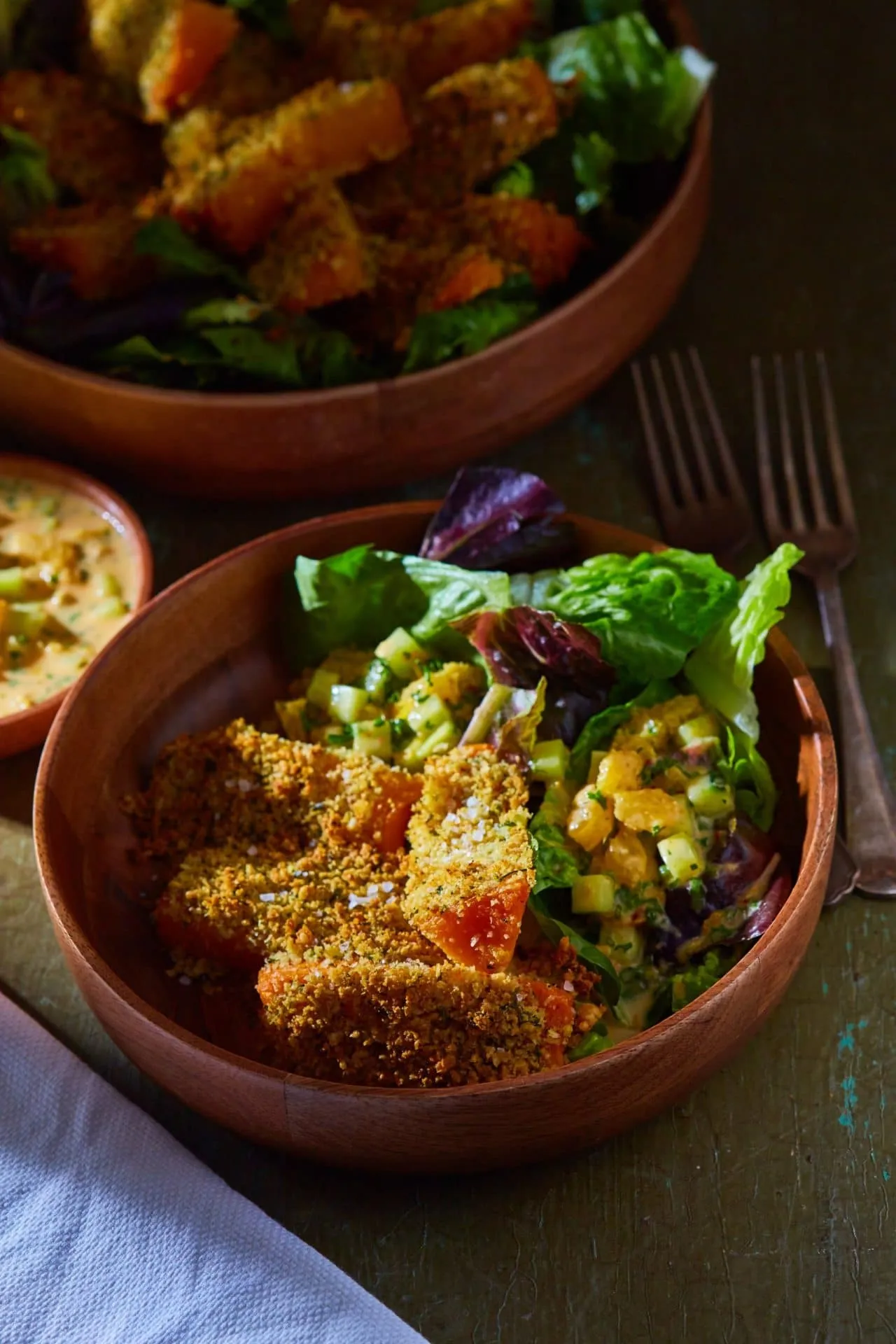 A parmezánt egy aprítógépben morzsásra zúzzuk, összekeverjük a panko morzsával (amit bátran helyettesíthetünk szárított-reszelt kenyérbéllel), és belemorzsoljuk a kéksajtot is, majd ragacsos-morzsásra őröljük. A cél az, hogy a kruszta a tökre tapadjon, viszont kellőképpen száraz is legyen a ropogás kedvéért. Sót, borsot és a megmaradt aprított petrezselymet is hozzákeverjük.
