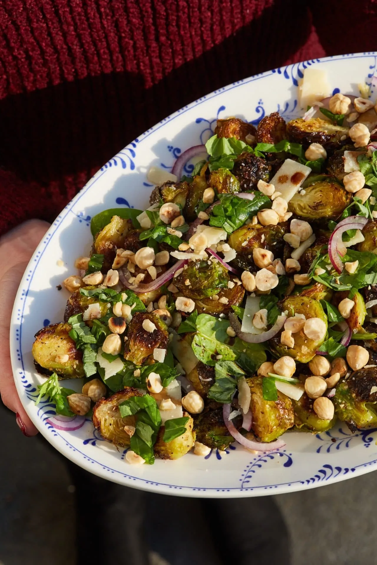 Egy nagy tányér aljára rakjuk a spenótot, erre jöhet a sült kelbimbó, a mogyoró, parmezán, olívaolaj, balzsamecet, a vékonyra szeletelt lila hagyma, az összetépkedett bazsalikom, végül egy kevés őrölt bors.