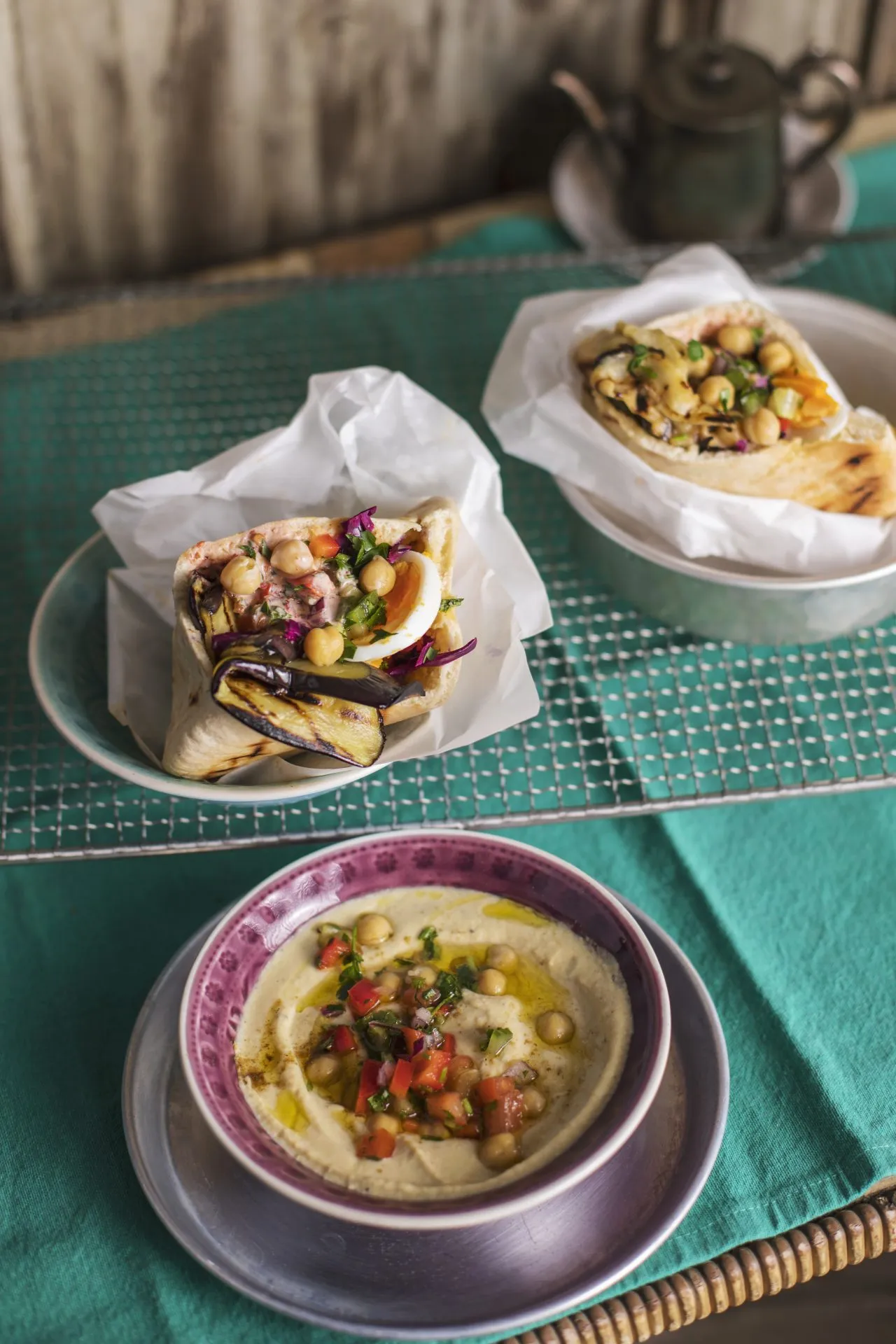 Az összeszereléshez egy serpenyőben kevés olajon átpirítjuk a pitákat. Levágjuk a végeit és kezdődhet a megtöltés: 2-3 evőkanál humusz, az arab saliból egy kevés, pár szelet padlizsán, a felszeletelt főtt tojásból pár darab, kevés csípős szósz, savanyított káposzta és ízlés szerint mindegyikből még egy kis adag, amíg csak fér a pitába.