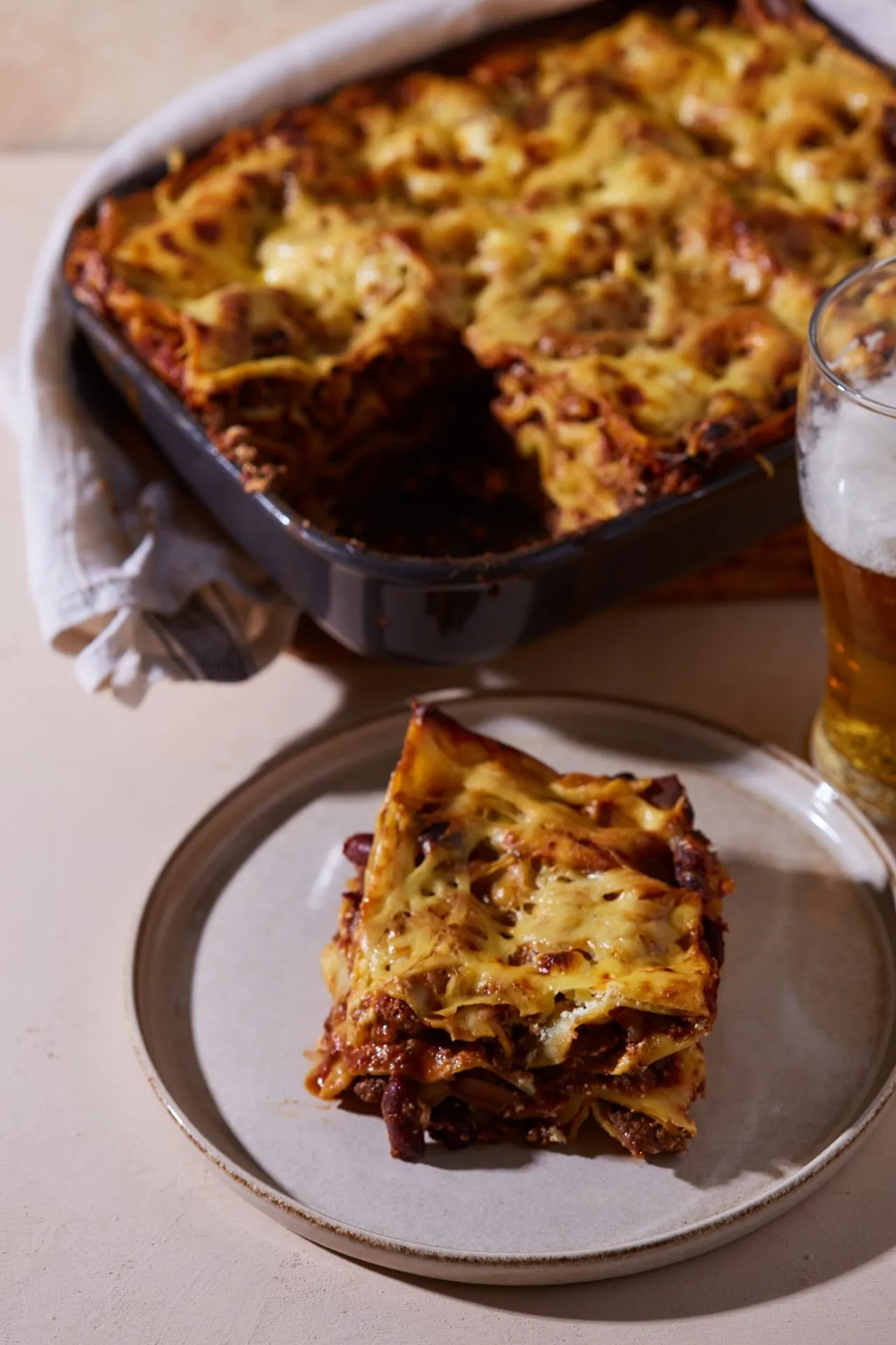 A lasagnetésztákat egy tepsibe rétegezzük a raguval úgy, hogy mindegyik réteg közé teszünk a tejfölből. Az utolsó réteg lasagnelapot megkenjük a maradék chilis babbal, rakunk rá kevés tejfölt, végül megszórjuk a reszelt sajttal, és 190 fokra előmelegített sütőben kb. 30-35 perc alatt megsütjük.