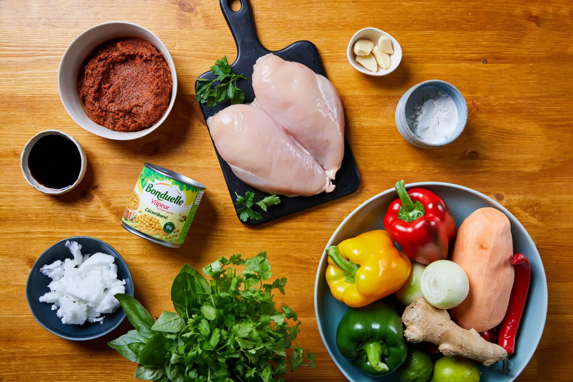 A wokban maradt zsiradékon kb. 5 perc alatt lepirítjuk a félfőre vágott hagymát, a felszeletelt fokhagymát és chilit, a reszelt gyömbért és a kés hátoldalával megcsapkodott citromnádat. Hozzáadjuk a vöröscurry-pasztát és a maradék 1 evőkanál curry fűszerkeveréket, majd ezzel is pirítjuk 2-3 percig. Ráöntjük a kókusztejet, hozzáadjuk a felkockázott édesburgonyát és a csíkokra vágott pritamin paprikát, felöntjük az alaplével vagy vízzel, felforraljuk, majd jöhet bele a koktélparadicsom és a csirke.