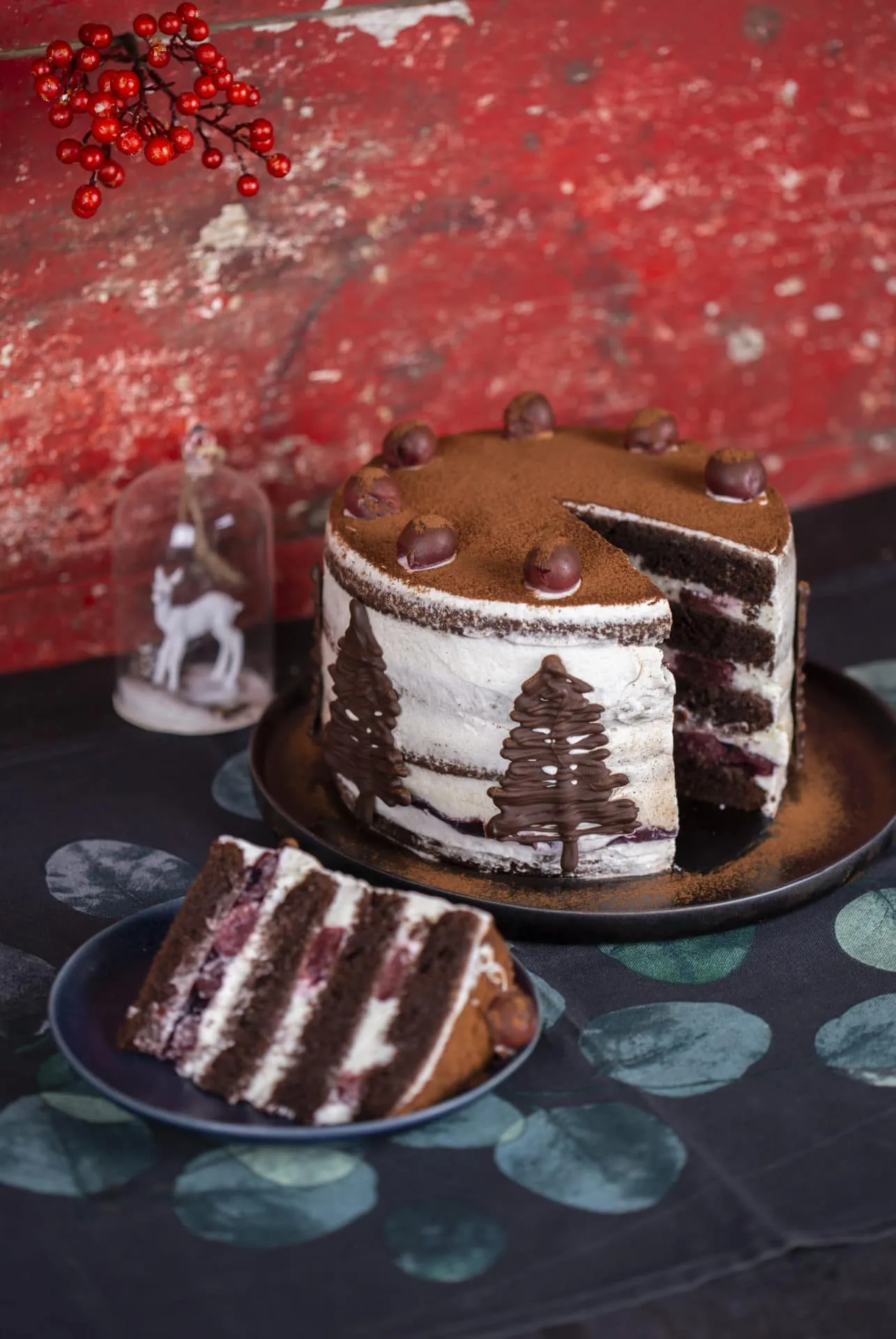 Amikor a torta kellően megdermedt, kivesszük a formából, lehúzzuk róla a sütőpapírcsíkot, és a maradék krémmel körbekenjük. A tetejét meggyszemekkel, kakaóporral, az oldalát pedig a csokifenyőkkel díszítjük.