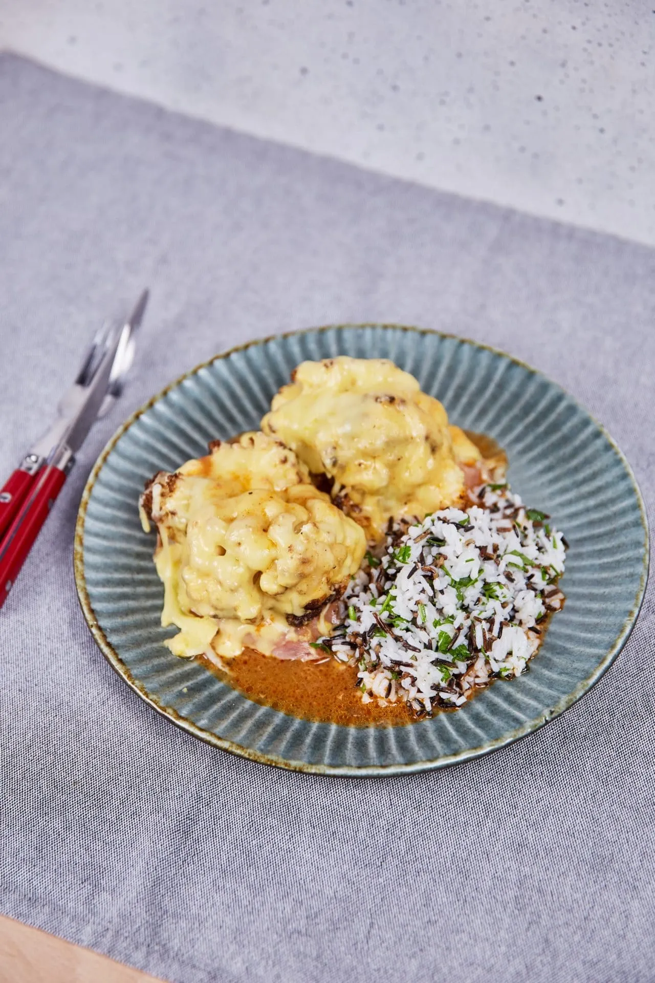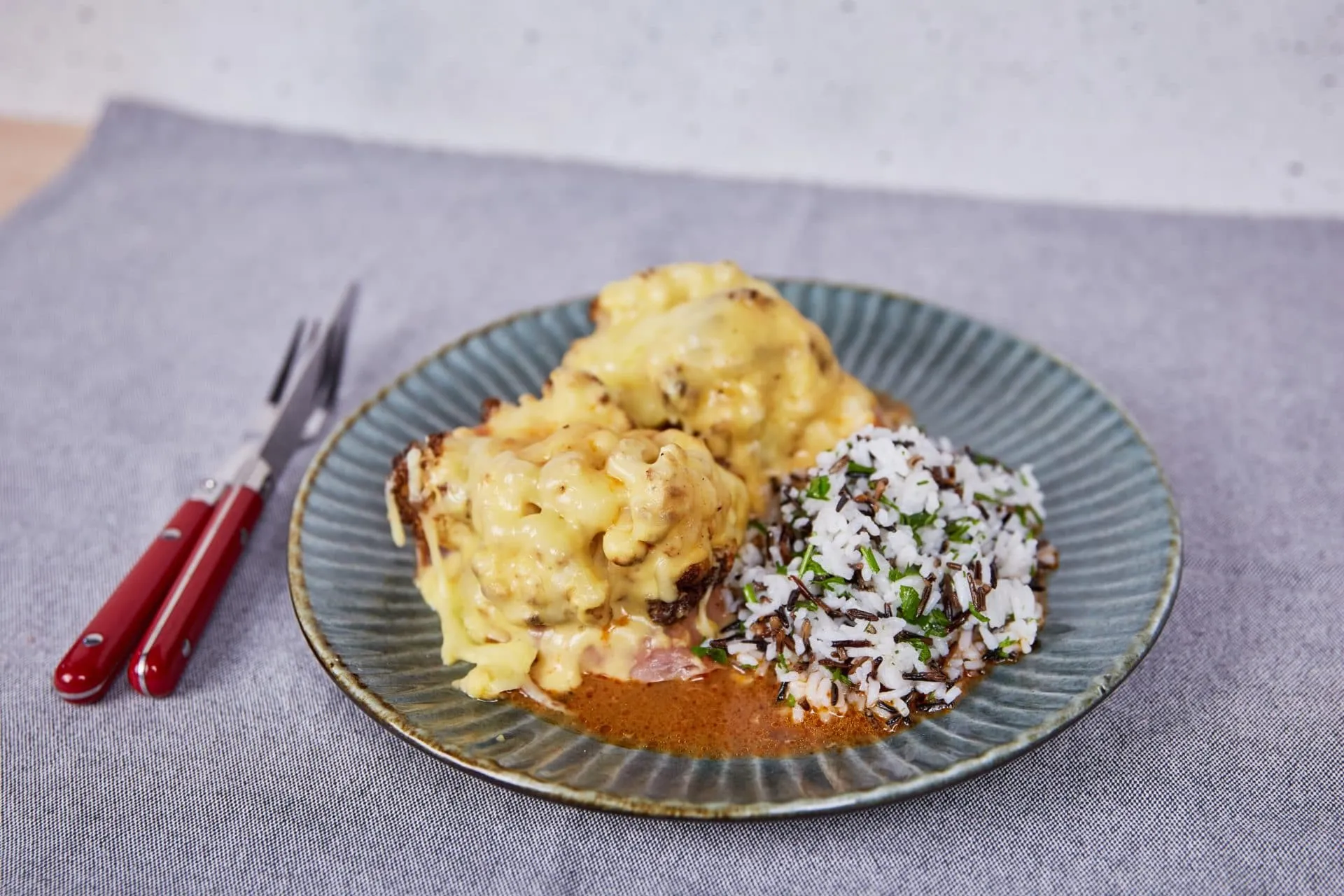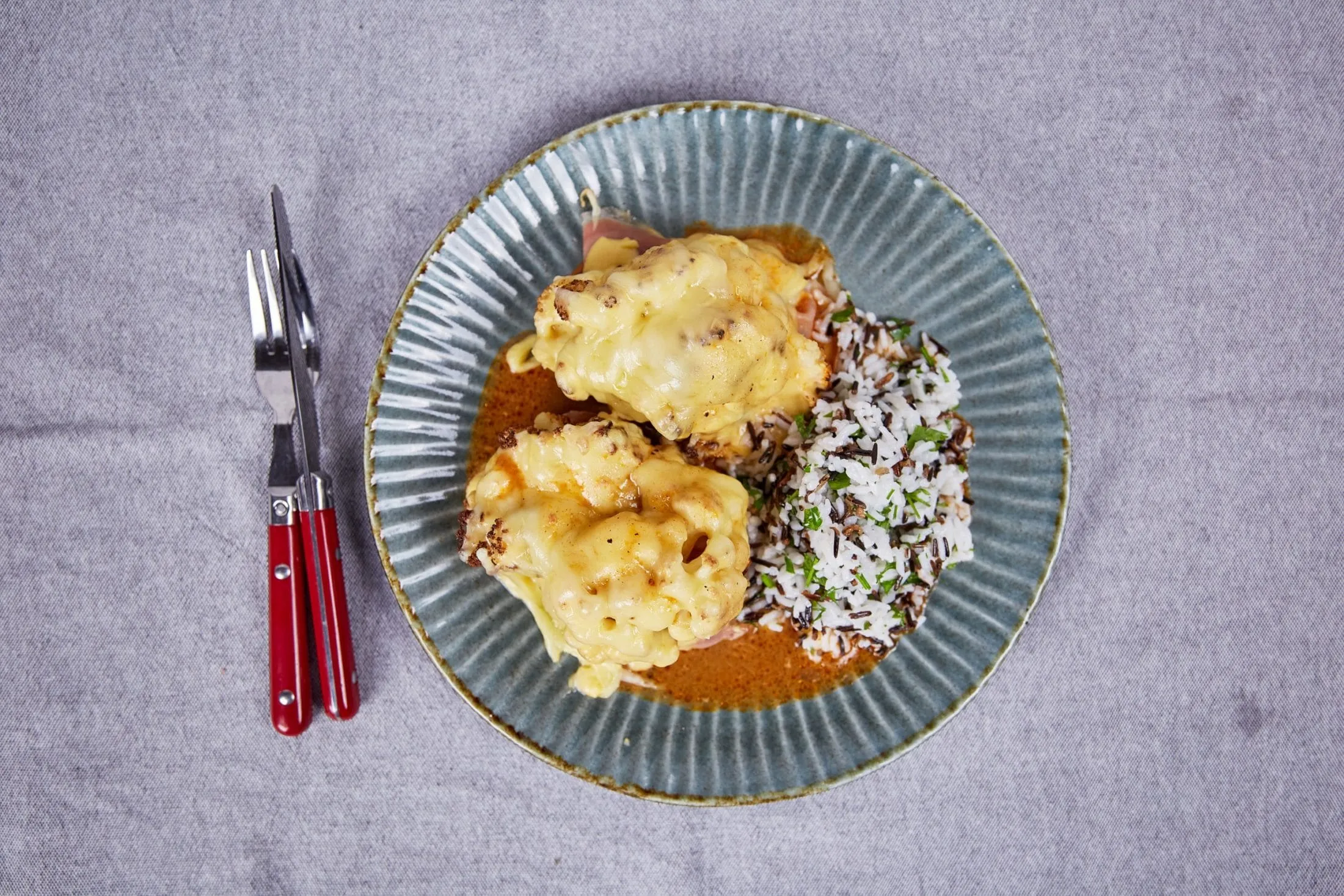 A besamelhez a vajat felolvasztjuk, kicsit megfuttatjuk a lisztet rajta, felöntjük a tejjel, sózzuk, hozzáadjuk a fehér borsot és a szerecsendiót, és csomómentesre keverjük. A tojásokat szétválasztjuk, a sárgáját belekeverjük a besamelbe, a fehérjét egy csipet sóval habbá verjük, majd azt is belekeverjük. Ezután összerakjuk az ételt: sütőpapírral bélelt tepsire rakjuk a húst, rátesszük a prosciuttót, a karfiolt, a besamelt, végül ráreszeljük a sajtot. 180 fokra előmelegített sütőben addig sütjük, amíg meg nem olvad a sajt. A rizzsel és a szafttal tálaljuk.