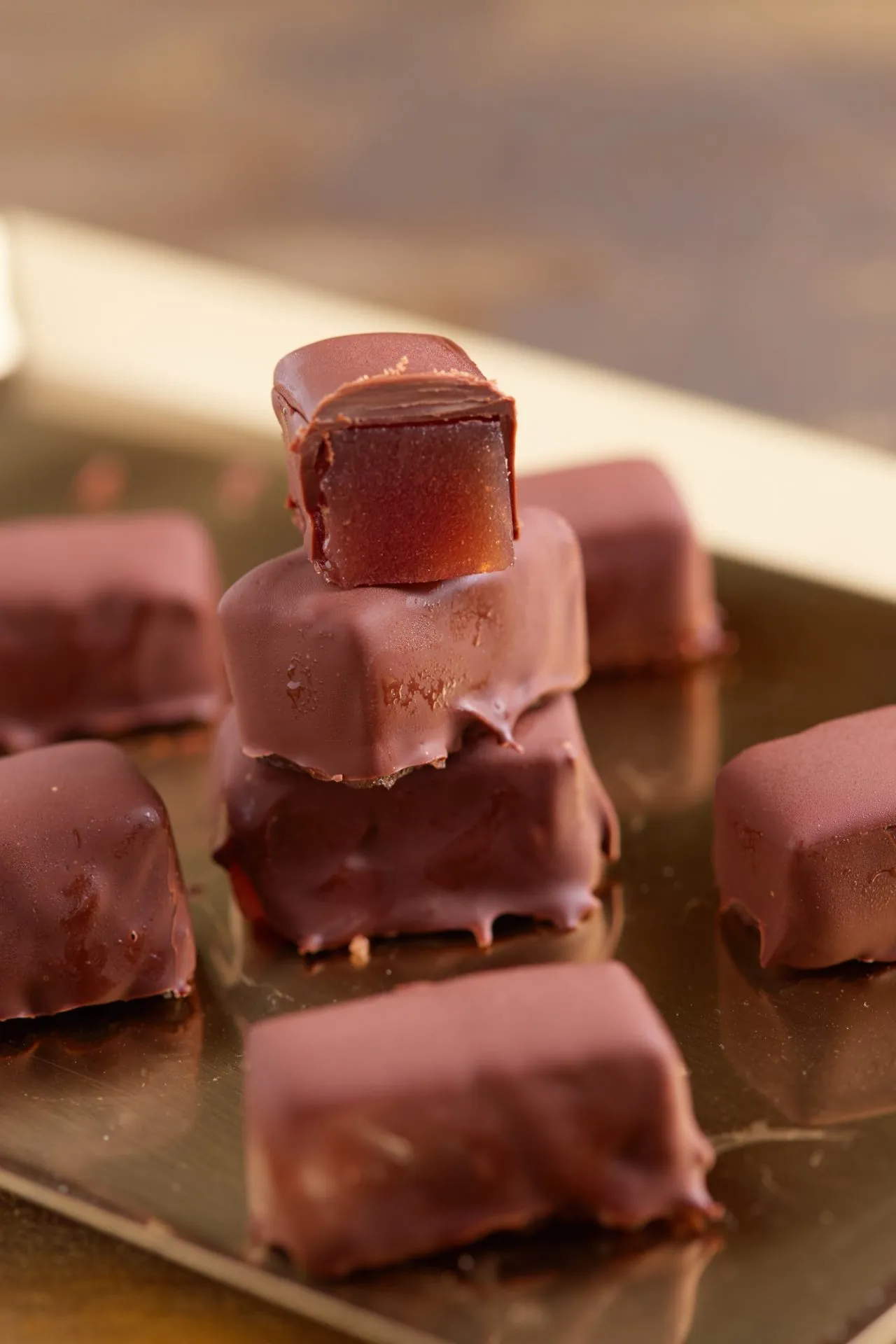 Ekkor szaloncukor nagyságú darabokra vágjuk, majd olvasztott csokiba forgatjuk, és egy rácsra tesszük. Az egészet berakjuk a hűtőbe kb. fél órára, hogy megdermedjen.