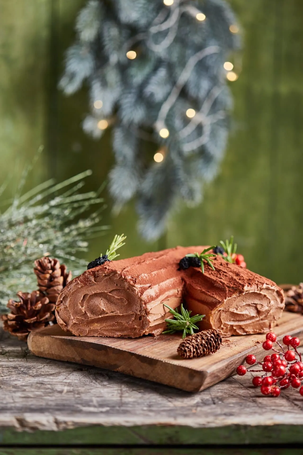 Körbekenjük a maradék krémmel a „fatörzsünket”, megszórjuk kakaóporral, majd pár bogyós aszalt gyümölccsel és rozmaringágakkal díszítjük. Hűtőbe rakjuk legalább 2-3 órára, hogy szépen szeletelhető legyen.