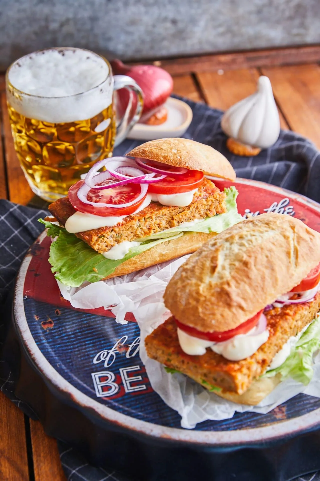 Salátalevelekkel, paradicsommal és lila hagymával megpakolt pirított ciabattában, majonézzel tálaljuk.