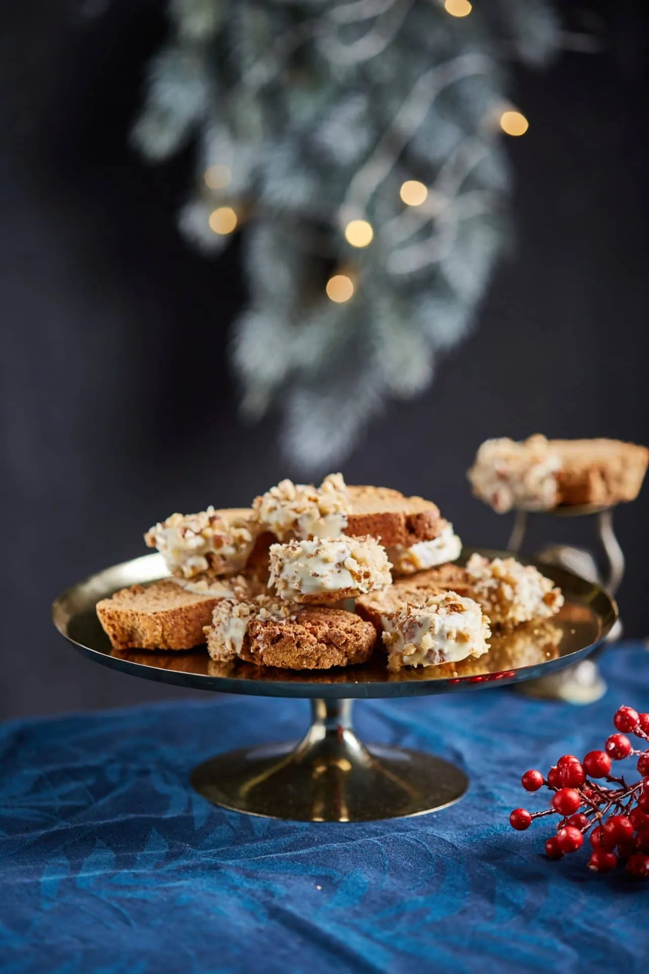 Mikor kihűltek, olvasztott fehér csokiba mártjuk az egyik felüket, és megszórjuk az apróra vágott dióval.