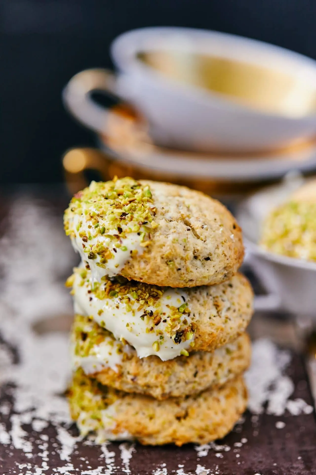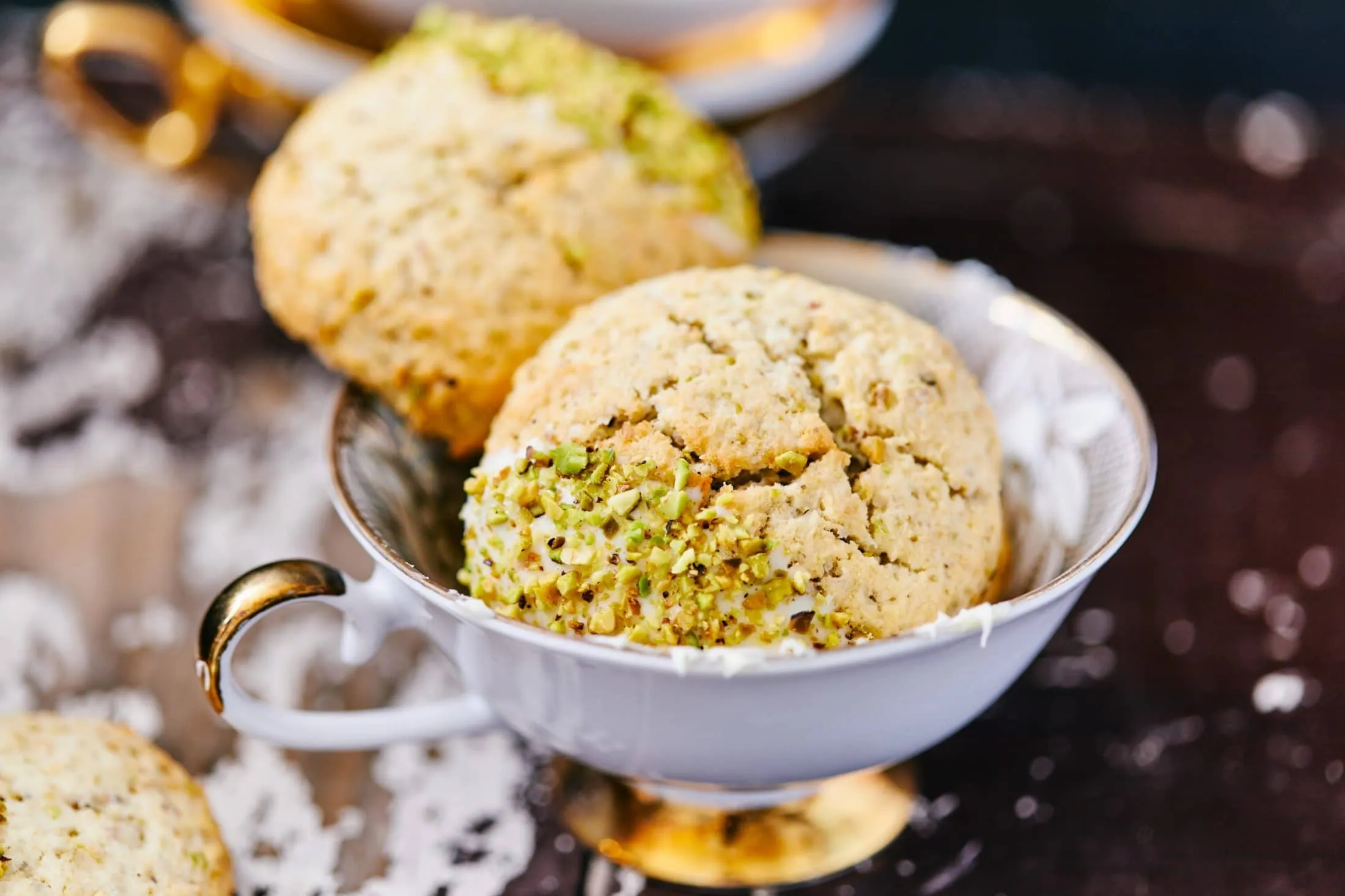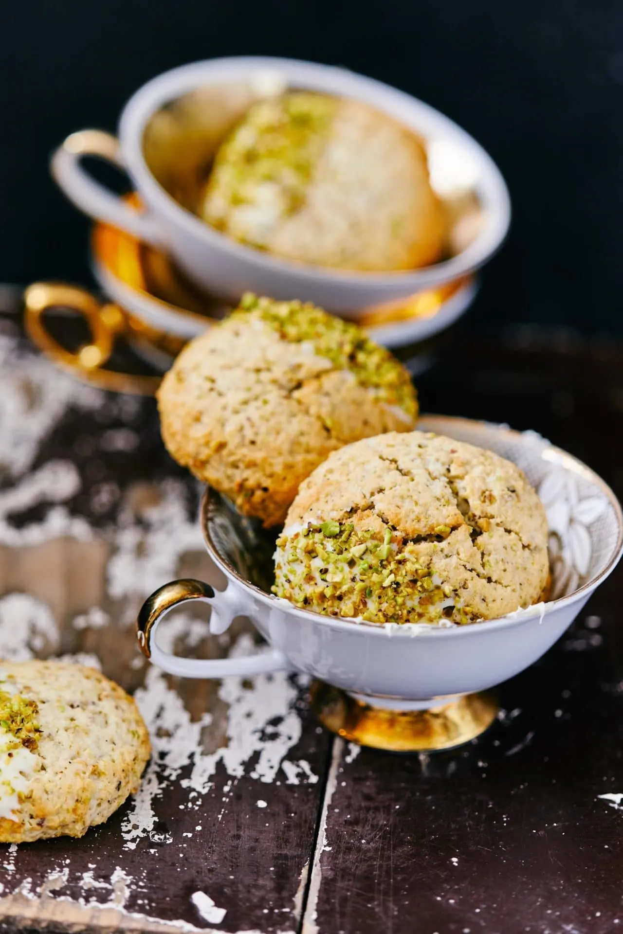 A fehér csokit apróra törjük, és mikróban felolvasztjuk. A kekszek felét belemártjuk a csokiba, és megszórjuk a félretett pisztáciával.