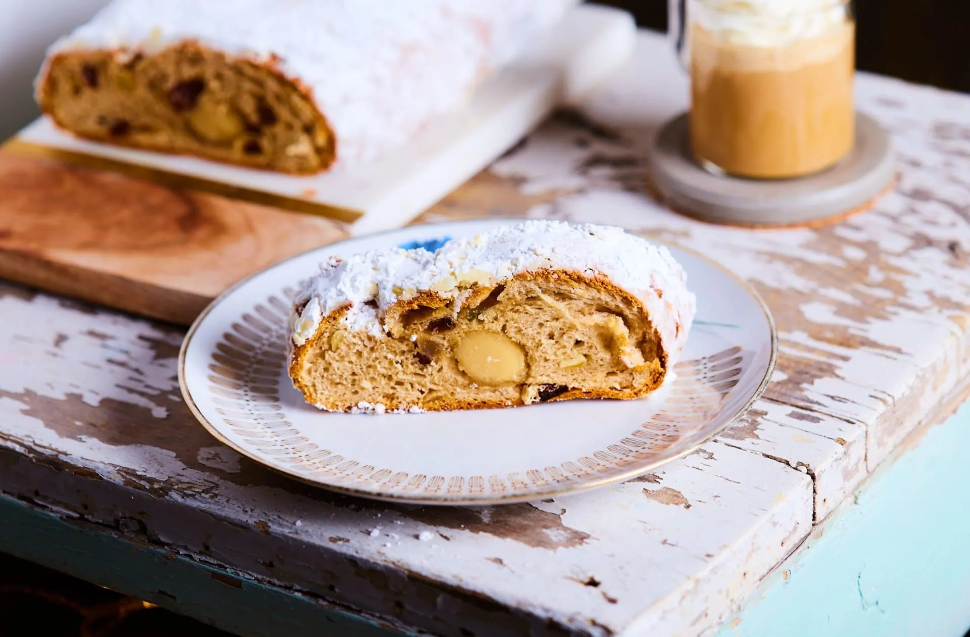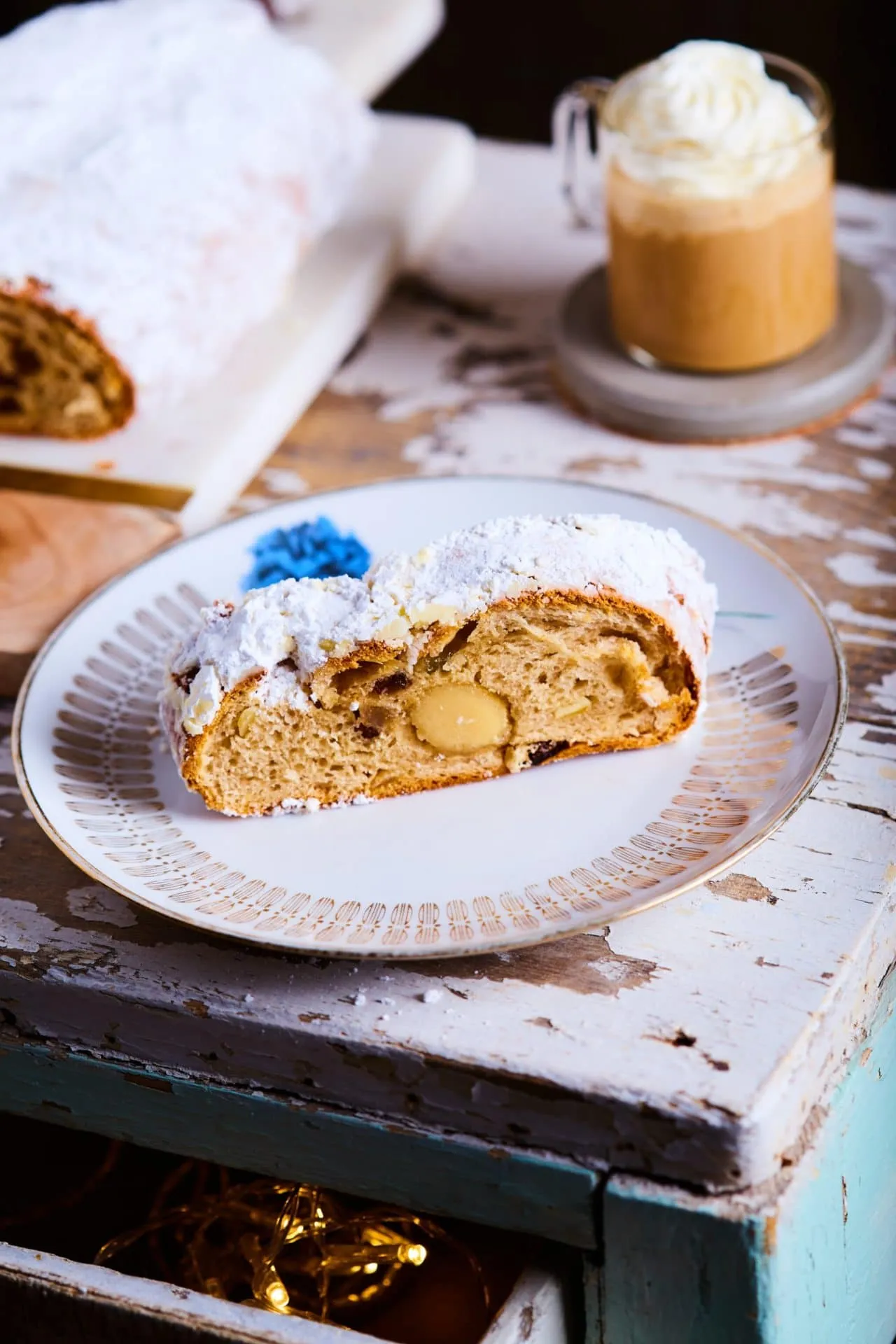 Ezután belegyúrjuk a rumba áztatott gyümölcsöket, és újabb 30 percig kelesztjük. Kicsit átgyúrjuk, 3 részre osztjuk, mindegyiket kb. 22 x 15 cm-es téglalappá nyújtjuk. A marcipánt elharmadoljuk, és 3 db 20 cm-es rudat formázunk belőle, amiket a tészták egyik, hosszabb szélére rakunk. Behajtjuk kb. a háromnegyedéig őket, majd a maradék ¼-ed részt ráhajtjuk a tésztahenger tetejére, és jól lenyomkodjuk.