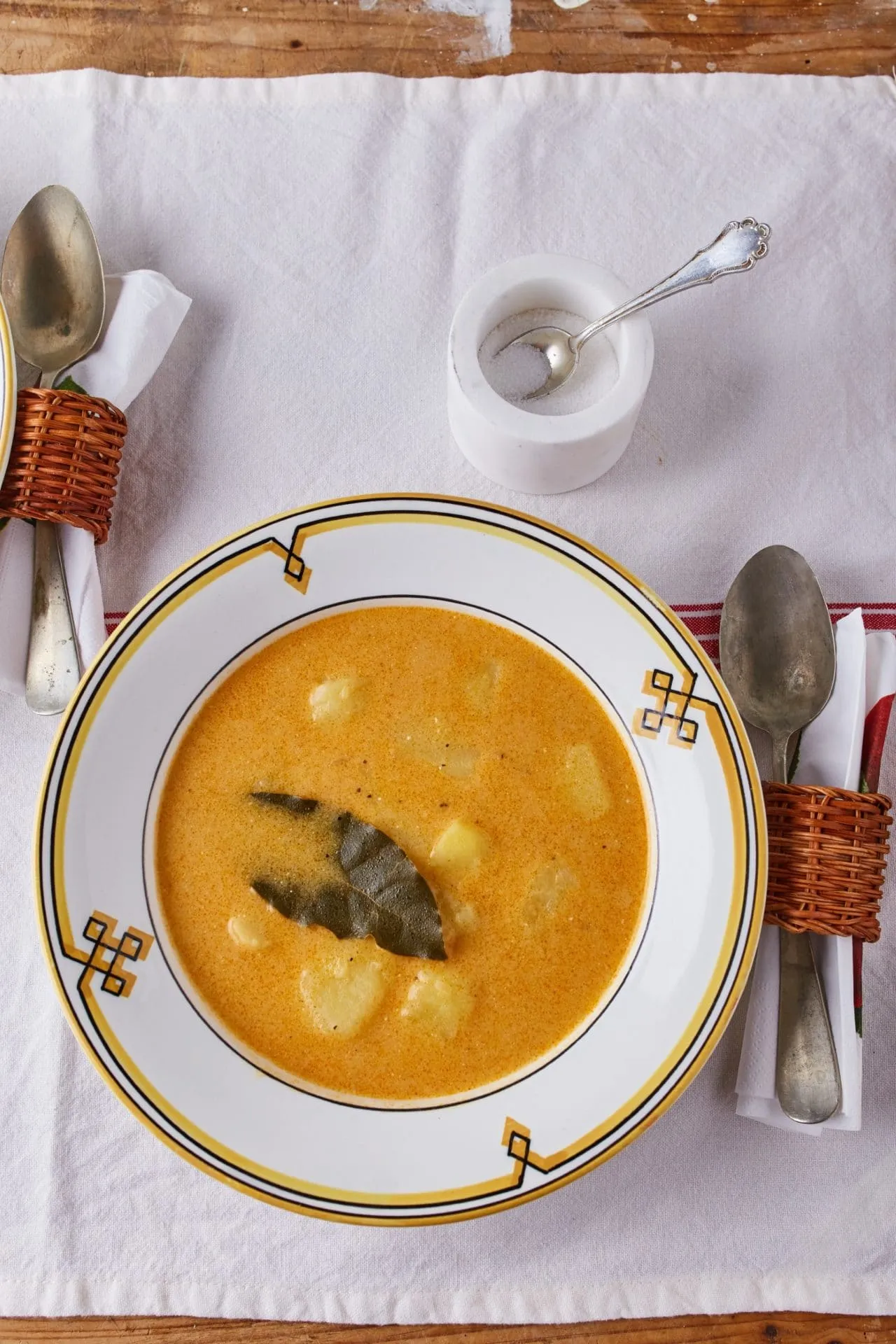 Beletesszük a kockázott burgonyát, a babérlevelet, a cukrot és a fehérborecetet, majd felforraljuk, és addig főzzük, amíg a burgonya megpuhul. A tejfölre merünk 2-3 merőkanállal a forró levesből, elkeverjük, és visszaöntjük ezt az egészet a levesbe.