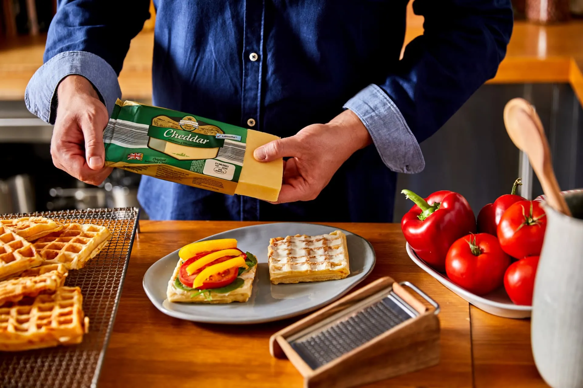 A hiperszuper sajtos gofriszendvicshez először a sütőport, a lisztet és a sót összekeverjük egy tálban. Hozzáadjuk a puha, felkockázott vajat, hozzáütjük a tojásokat, hozzáöntjük a tejet és mehet bele a kis lyukú reszelőn lereszelt vörös cheddar is. Csomómentesre keverjük a tésztát, majd 1-1 nagyobb evőkanállal a felmelegített, enyhén kiolajozott gofrisütő mélyedéseibe teszünk a tésztából, és 3-4 perc alatt készre sütjük a gofrikat.