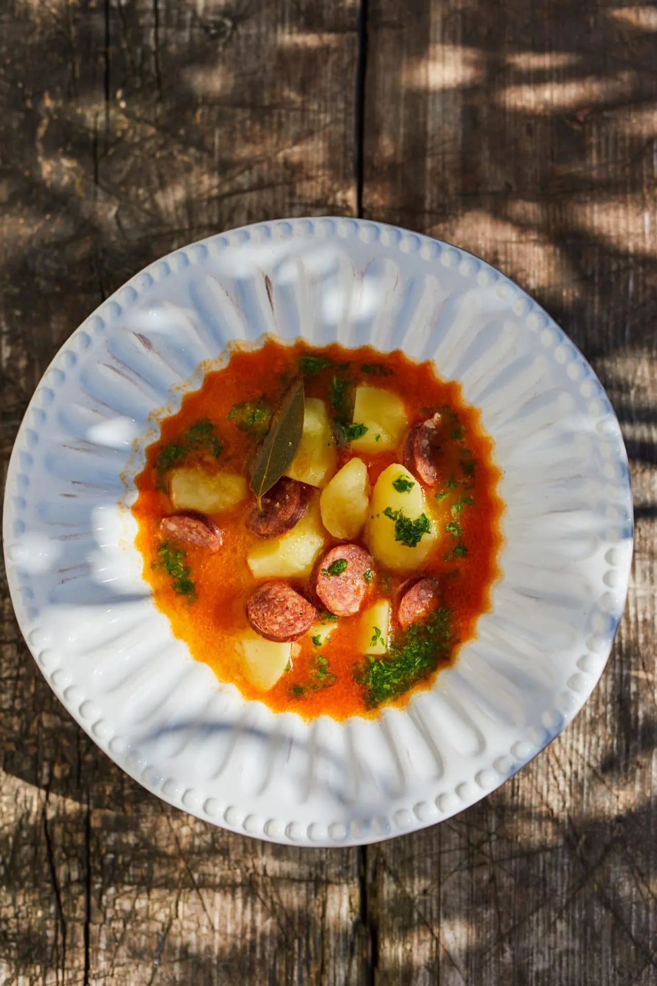 Beleöntjük a maradék vizet, beletesszük a karikázott kolbászt, a felkockázott burgonyát, a babérlevelet, és addig rotyogtatjuk, amíg a burgonya meg nem főtt. A végén hozzátesszük az ecetet, és beállítjuk a sósságát. A turbolyát egy robotgépbe tesszük az olívaolajjal, összedaráljuk, majd a leves tetejére csorgatjuk, és fogyasztjuk.