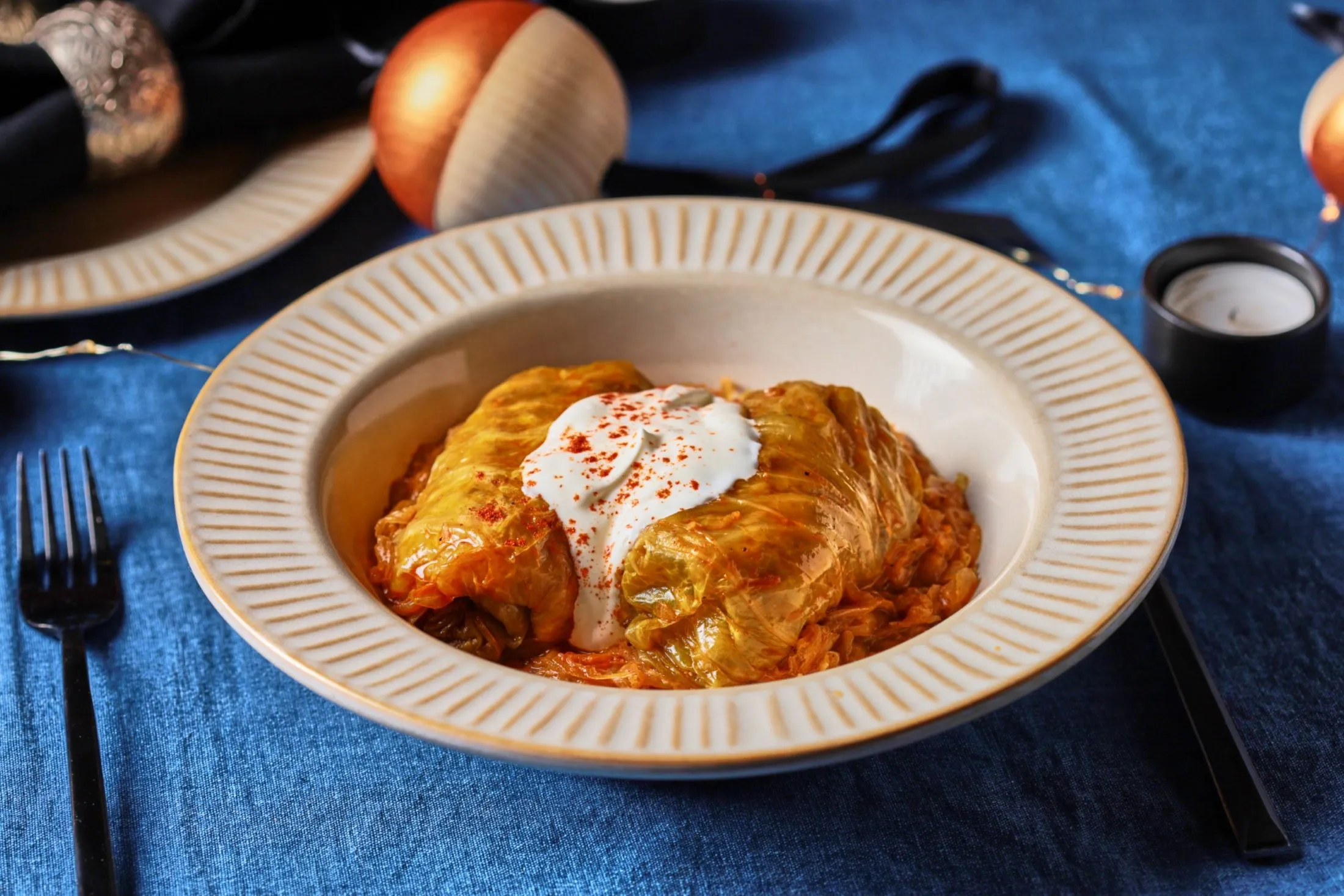 Ezután a töltött káposztákat kiszedjük, az alapot pedig behabarjuk a vízzel és keményítővel kikevert tejföllel. Az alapból szedünk a tányérra, erre mehet a töltött káposzta, megküldjük egy kis tejföllel, és megszórjuk egy kis pirospaprikával.