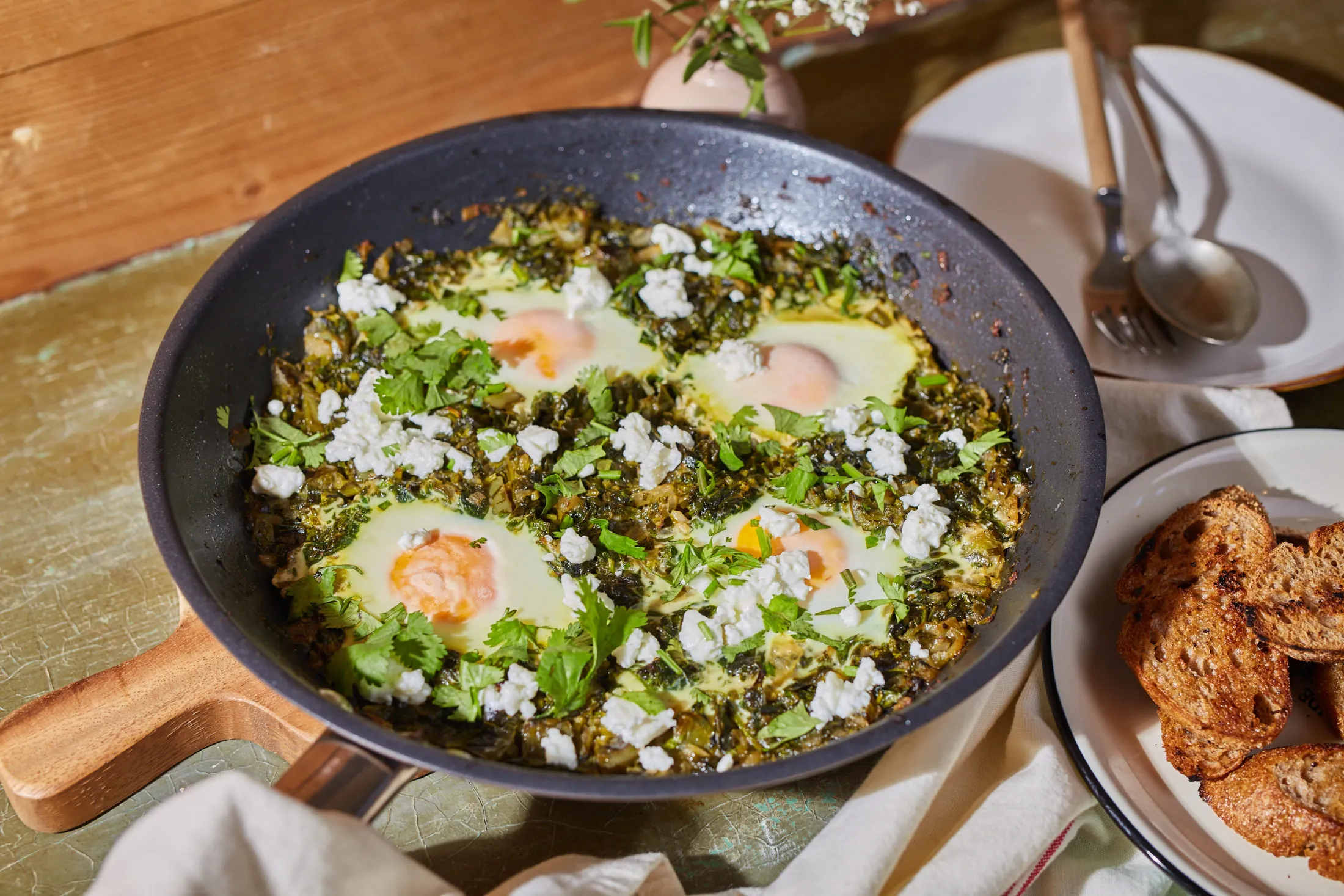 Közben durvára vágjuk a spenótot, és 4-5 perc múlva rádobjuk az alapra, majd megszórjuk egy csipet sóval. Ha összeesett a spenót, beledobjuk az apróra vágott friss zöldfűszereket is. Összeforgatjuk, majd 4 kis mélyedést készítünk a raguban és bele ütjük a tojásokat, megszórjuk őket egy kis sóval, végül 200 fokos sütőben 10-12 perc alatt megsütjük.