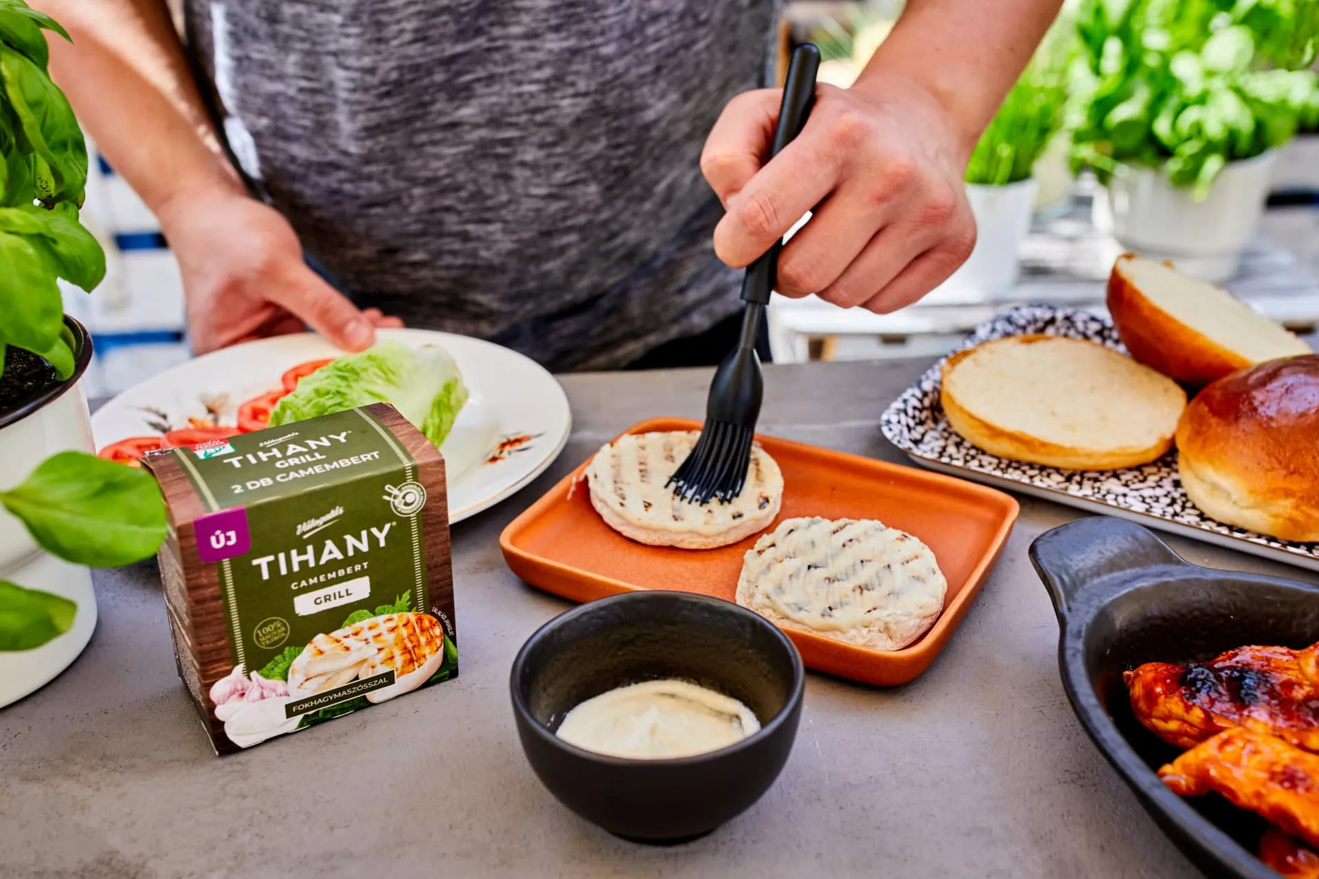 Ezután a forró grillre helyezzük a camembert sajtokat és a félbevágott hamburgerzsemléket is, és oldalanként 1-2 perc alatt megpirítjuk őket. A sajtokat bekenjük a fokhagymás szósszal, amit a doboz tartalmaz.