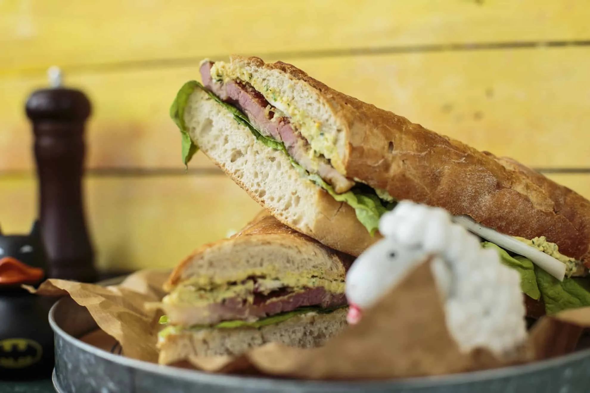 Az újhagymát hosszában felszeleteljük, a salátát pedig leveleire szedjük. A bagettet hosszában kettévágjuk és a sütőben megpirítjuk. A sonkából szeleteket vágunk, egy kevés olajon közepes lángon oldalanként 4-5 perc alatt meggrillezzük. Jöhet az összeállítás: a pirult bagett alját megkenjük a tormakrémmel, erre jönnek a salátalevelek, majd a sült sonka. Erre tesszük az újhagymákat, majd a marinált retket, végül pedig a bagett tetejét a tojáskrémmel kenjük meg gazdagon, és készen is vagyunk!