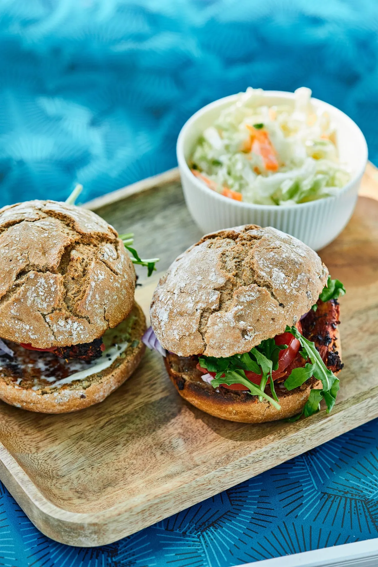 A salátához vékony csíkokra vágjuk a zöldségeket, és összeforgatjuk a többi hozzávalóval. A bucikat elfelezzük, és feltesszük a grillre pirulni a csirkével együtt. Ha megsült a csirke, a bucik alját megkenjük majonézzel, erre mehet a hús, paradicsomszelet, vékonyra vágott lila hagyma, végül pedig a rukkola. A szendvicset a salival tálaljuk.